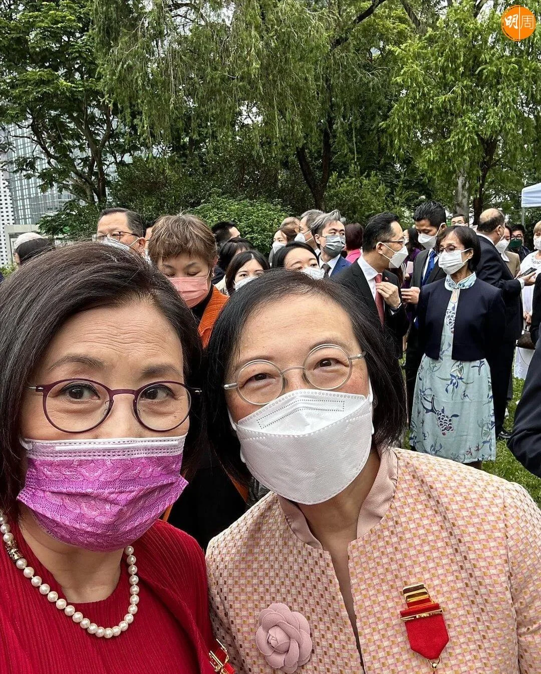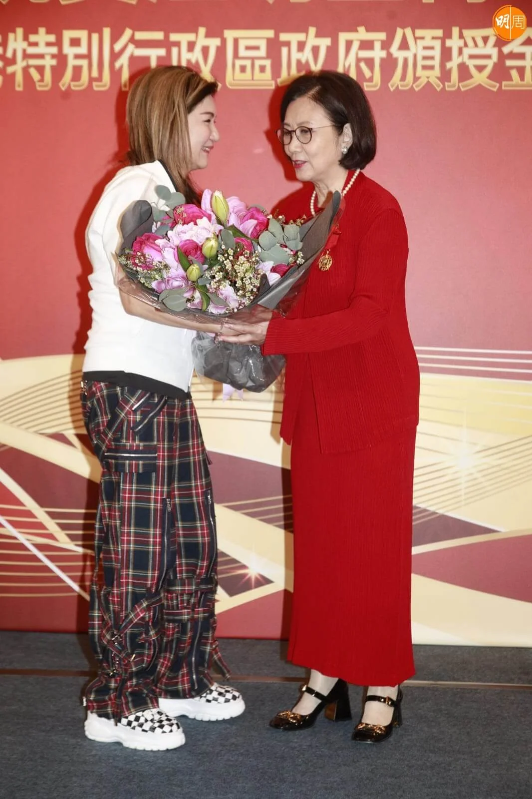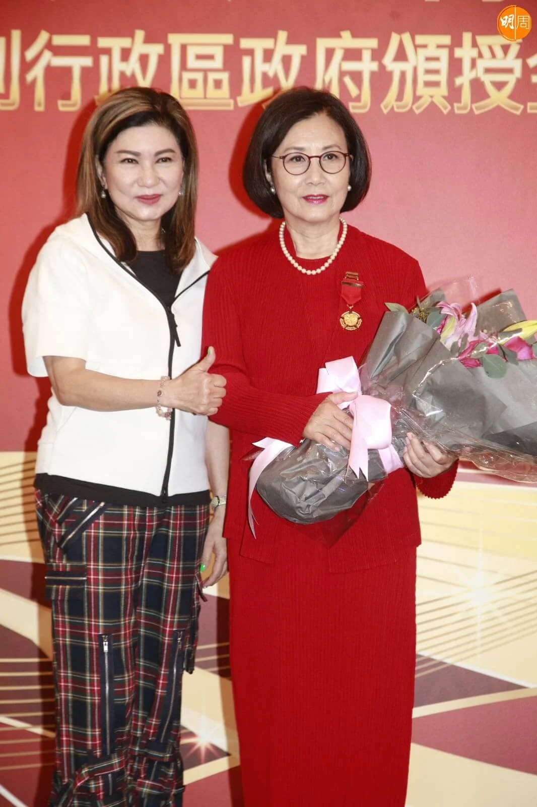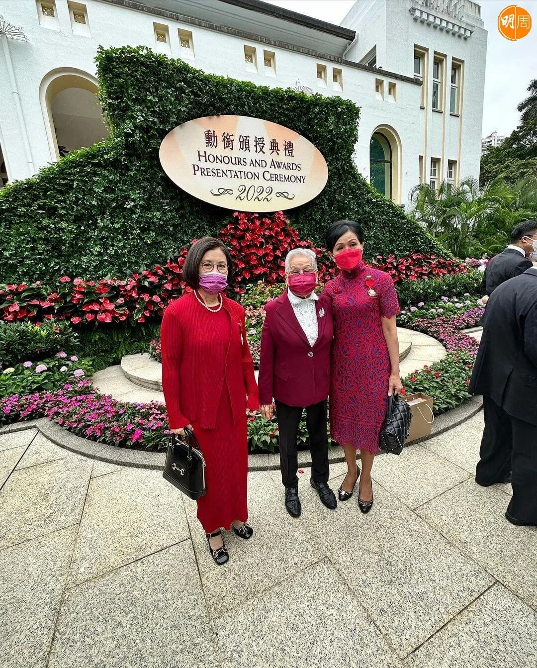汪明荃今日(5日)出席禮賓府舉行的勳銜頒授典禮,接受特首李家超頒授的金紫荊星章。阿姐穿着紅色套裝,與老公羅家英結伴亮相,除了與特首及夫人一起合照,亦與前食衞局局長陳肇始及一眾賓客留影,記錄珍惜時刻。