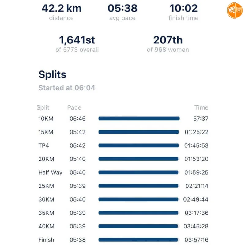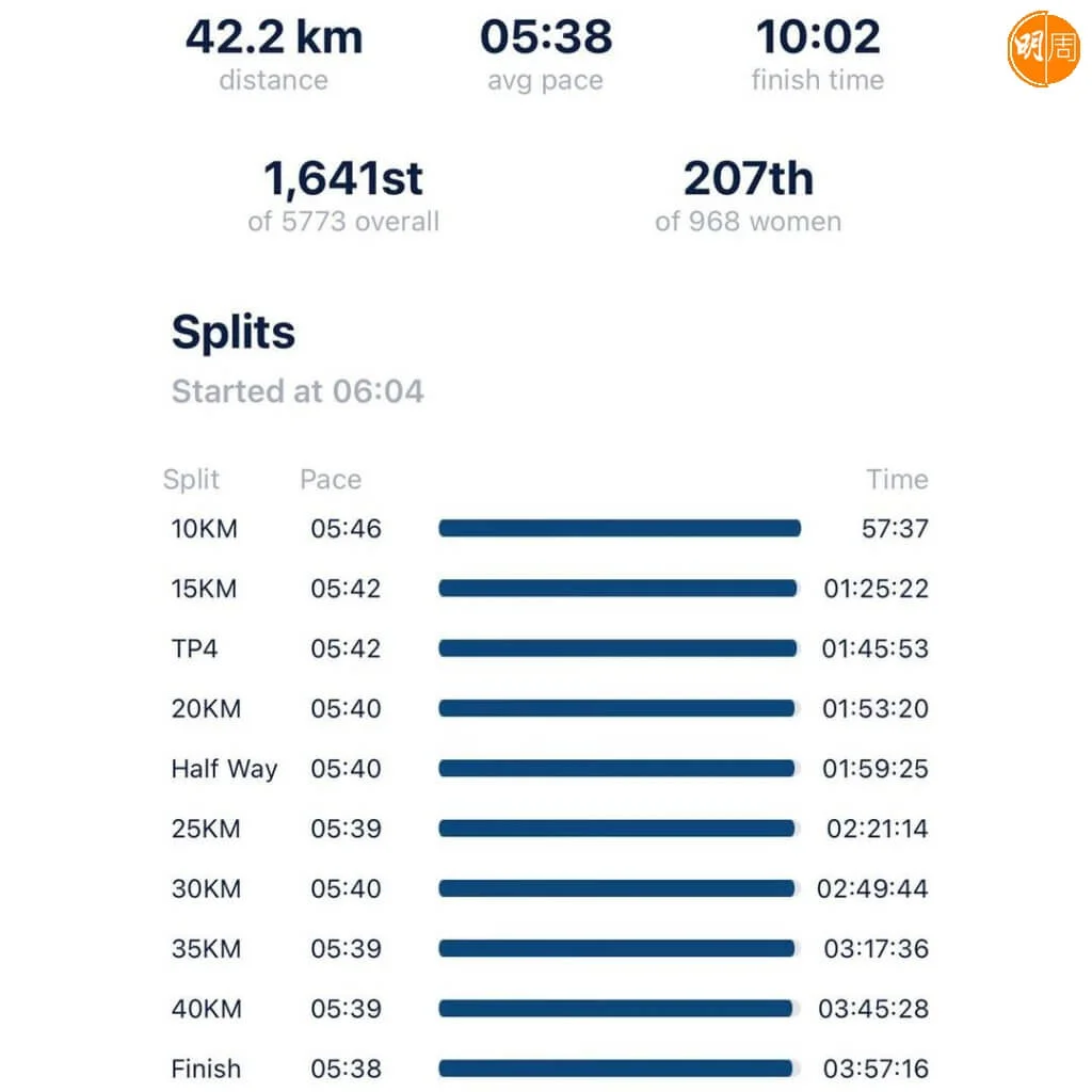 Inez亦在IG分享感受:「請相信自己是可以的,由於以前嘅全馬我一開跑都一味衝衝衝,衝到最後就一定撞牆。跑到最後都係捱得好辛苦咁完走,今次我終於大個女啦,一開始開得好穩陣好保守,食gel都係每7K就食,去到最後真係仲有貨,不過太遲加速,完走時都仲有貨。但係呢個成績我已經好滿足好滿足,天氣熱再加濕氣100%,一直都係想sub 4但係唔敢大大聲講因為驚自己做唔到,最後無傷完走再sub 4好滾動。完走見到sir face 係最最最快樂。」