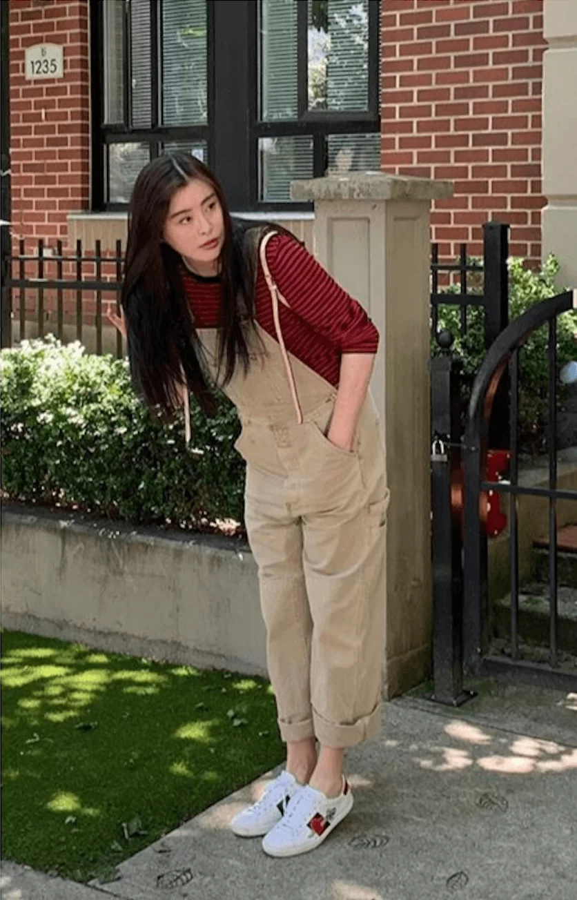 見佢披散一把烏黑長髮,身穿紅色間條衫、搭配卡其色吊帶褲,活力十足!