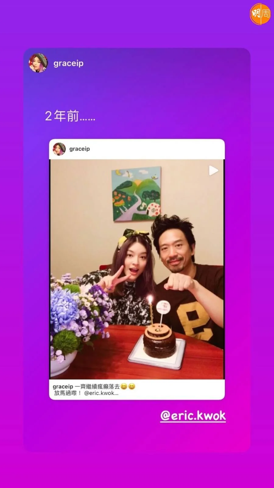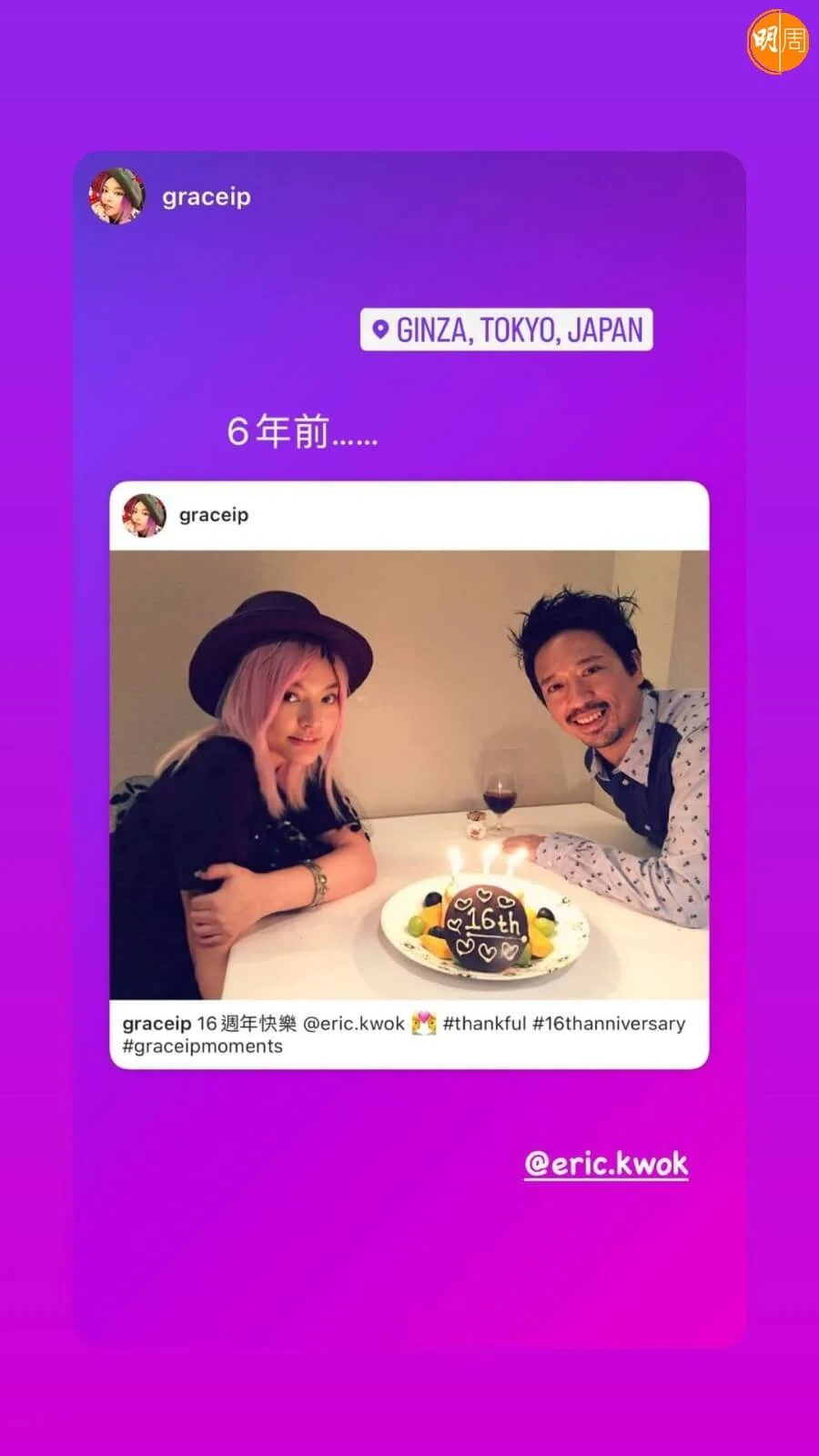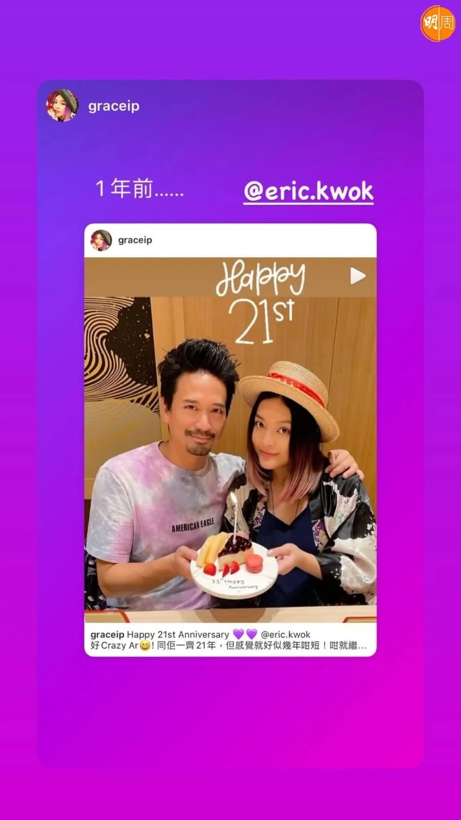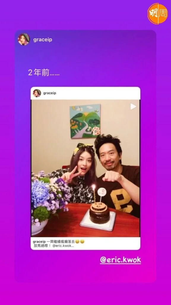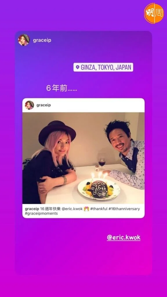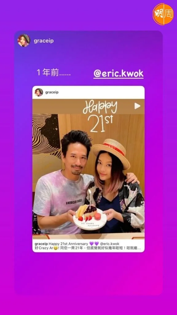 郭偉亮(Eric Kwok)與葉佩雯(Grace)拍拖11年後,於2011年結婚,二人一起22年,依然恩愛。Eric與Grace於今日(8日)22周年紀念日,各自在社交網發文慶祝,除一起甜蜜切蛋糕外,Grace還貼上二人這些年來的拍拖舊照;Eric則分享不同周年的慶祝照。