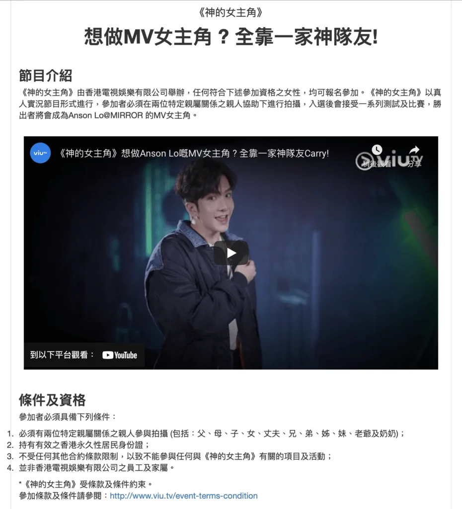 噚日ViuTV宣佈籌備全新真人騷《神的女主角》,公開招募Anson Lo MV女主角。咁點樣先可以成為「神的女主角」呢?首先要搵2位家庭成員幫手,組隊係節目闖關,挑戰節目組考核爭取出線。特定親屬關係廣泛,包括爸爸、媽媽、兄弟姊妹、老公、老婆、爺爺、嫲嫲、公公、婆婆、老爺或者奶奶,只要係「神隊友」就得。