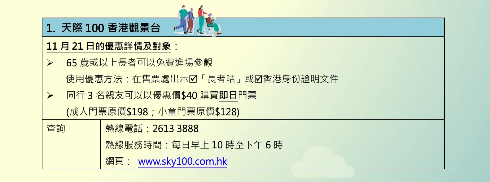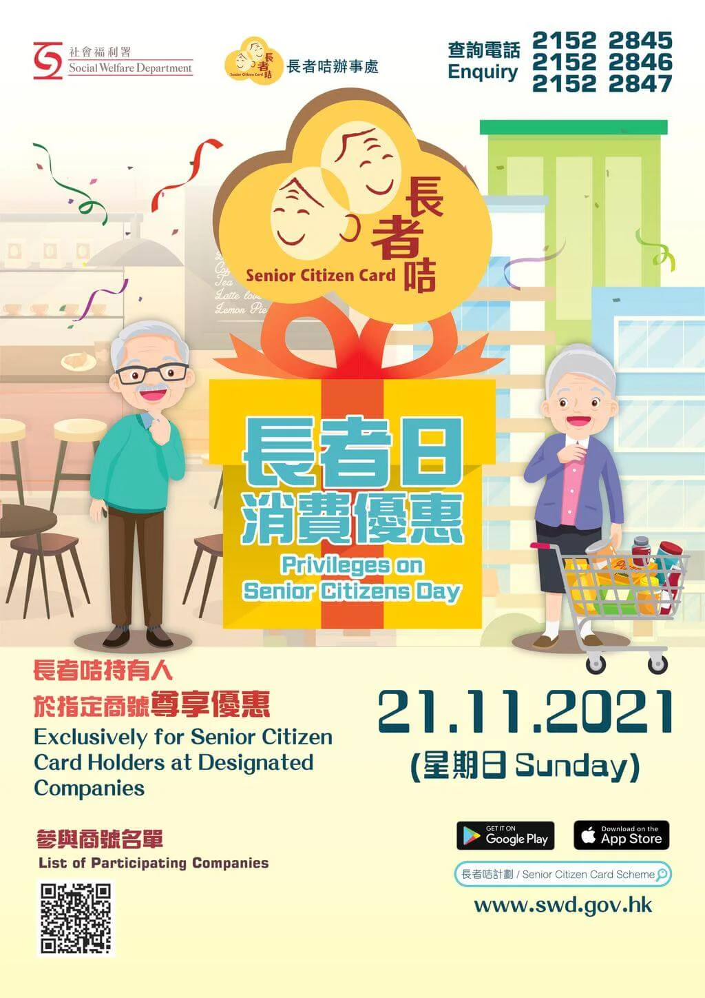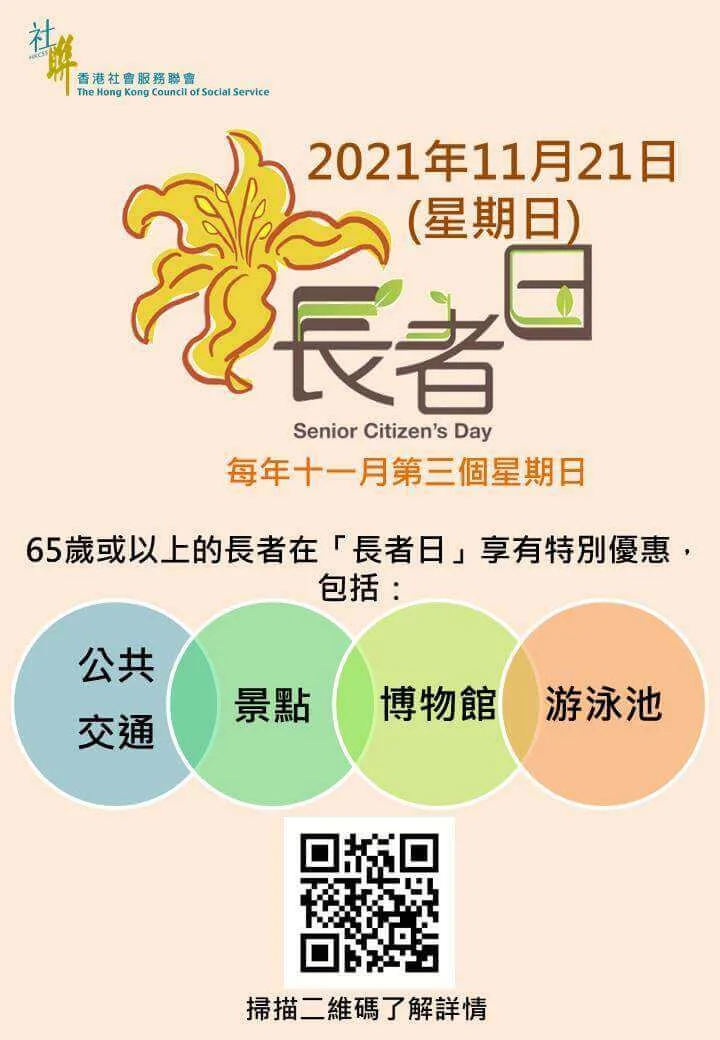 今周日(11月21日)為「長者日」,今年「長者日」以「全城護老」為主題,透過連繫政府部門、公共交通營運商及景點營辦機構,於當日為長者提供特別優惠,向長者致意,並鼓勵長者與社區保持連繫。為了向長者表達關懷和敬意,社會福利署(社署)籌辦「長者日消費優惠」活動,邀請本地飲食及零售業界於當日為長者咭持有人提供特別折扣和優惠。