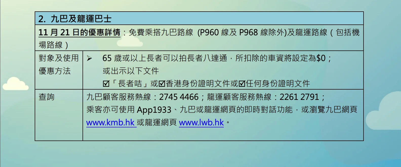 長者只要出示證明文件或使用長者/個人八達通,即可免費乘搭港鐵、輕鐵、港鐵巴士、新巴、城巴、九巴、龍運巴士、新大嶼山巴士(1R綫除外)、電車,將軍澳至觀塘區內7條綠色專綫小巴路綫。