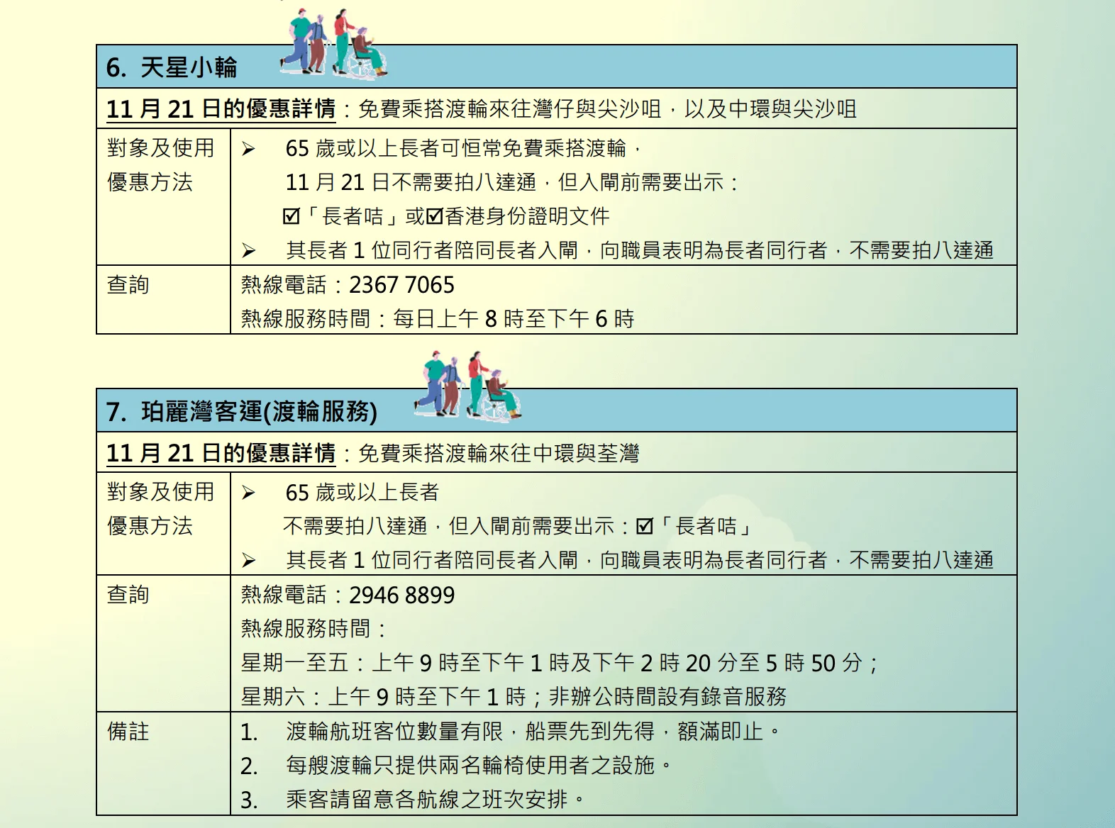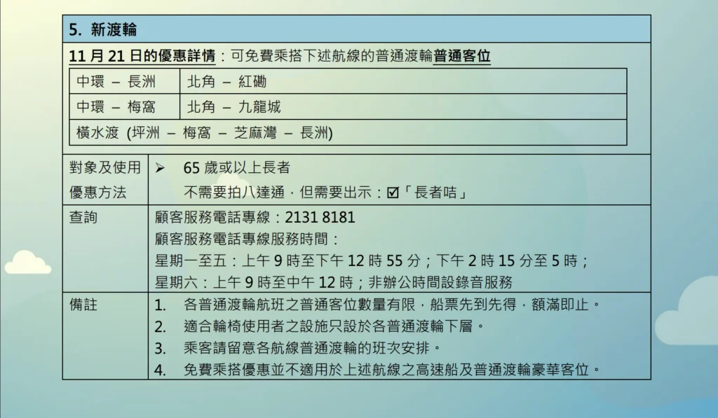 天星小輪亦會維持長者免費乘搭渡輪的優惠,當天更可攜同1名同行者免費乘搭來往灣仔與尖沙咀及中環與尖沙咀的航綫。
