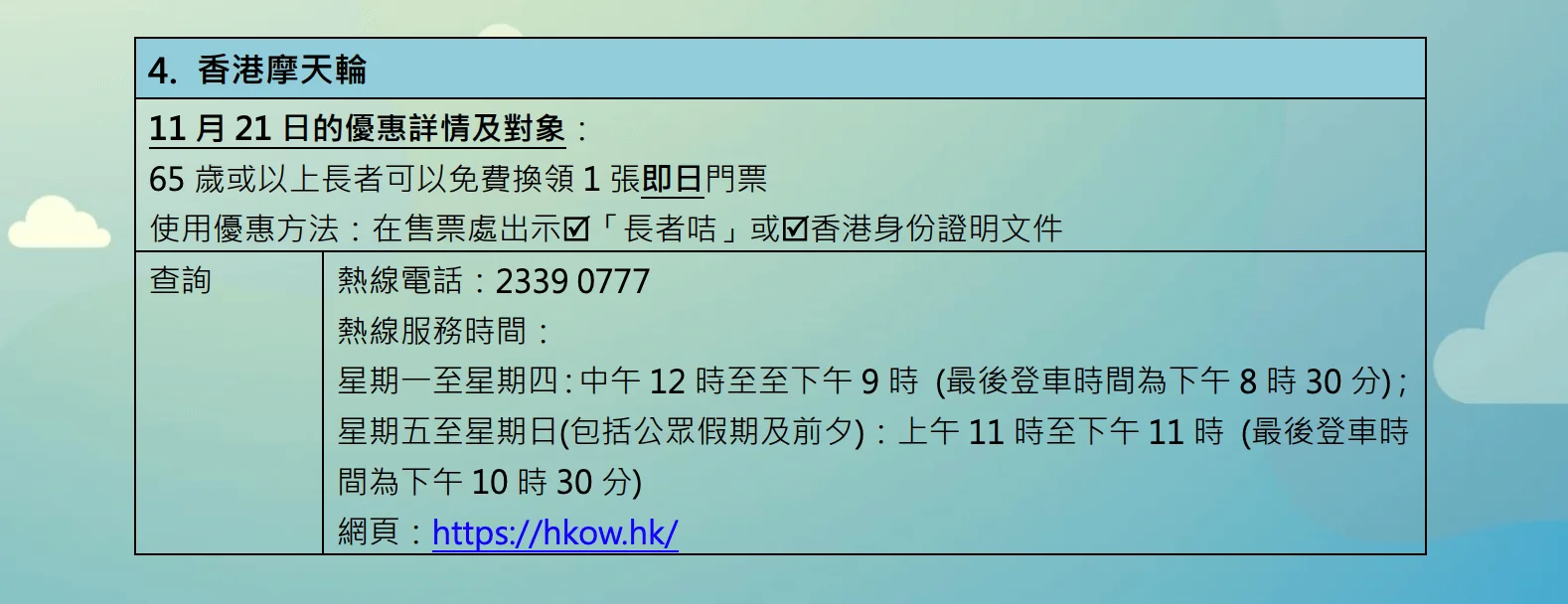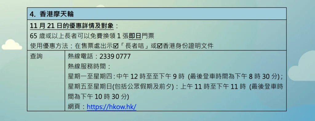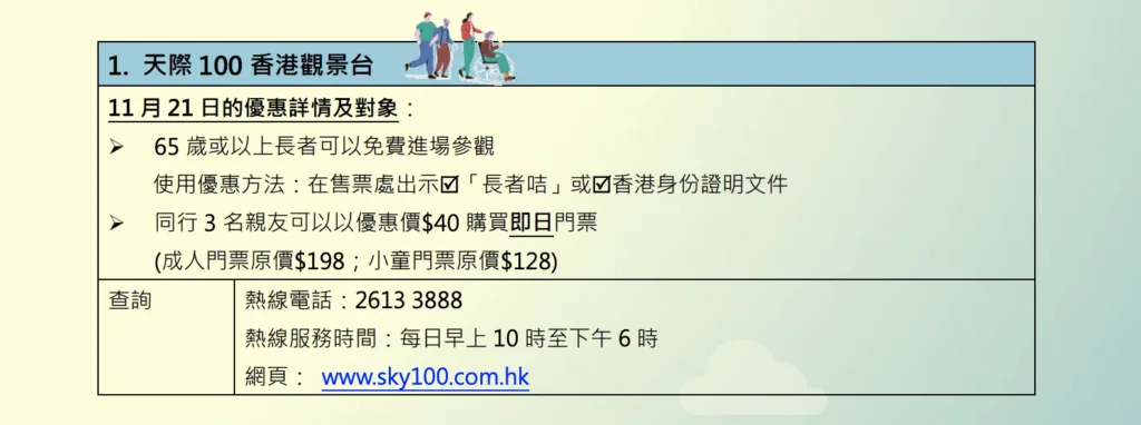 多個旅遊景點將於長者日當天免費開放予長者,包括天際100香港觀景台,位於中環的香港摩天輪,長者可憑長者咭或身份證明文件免費入場。