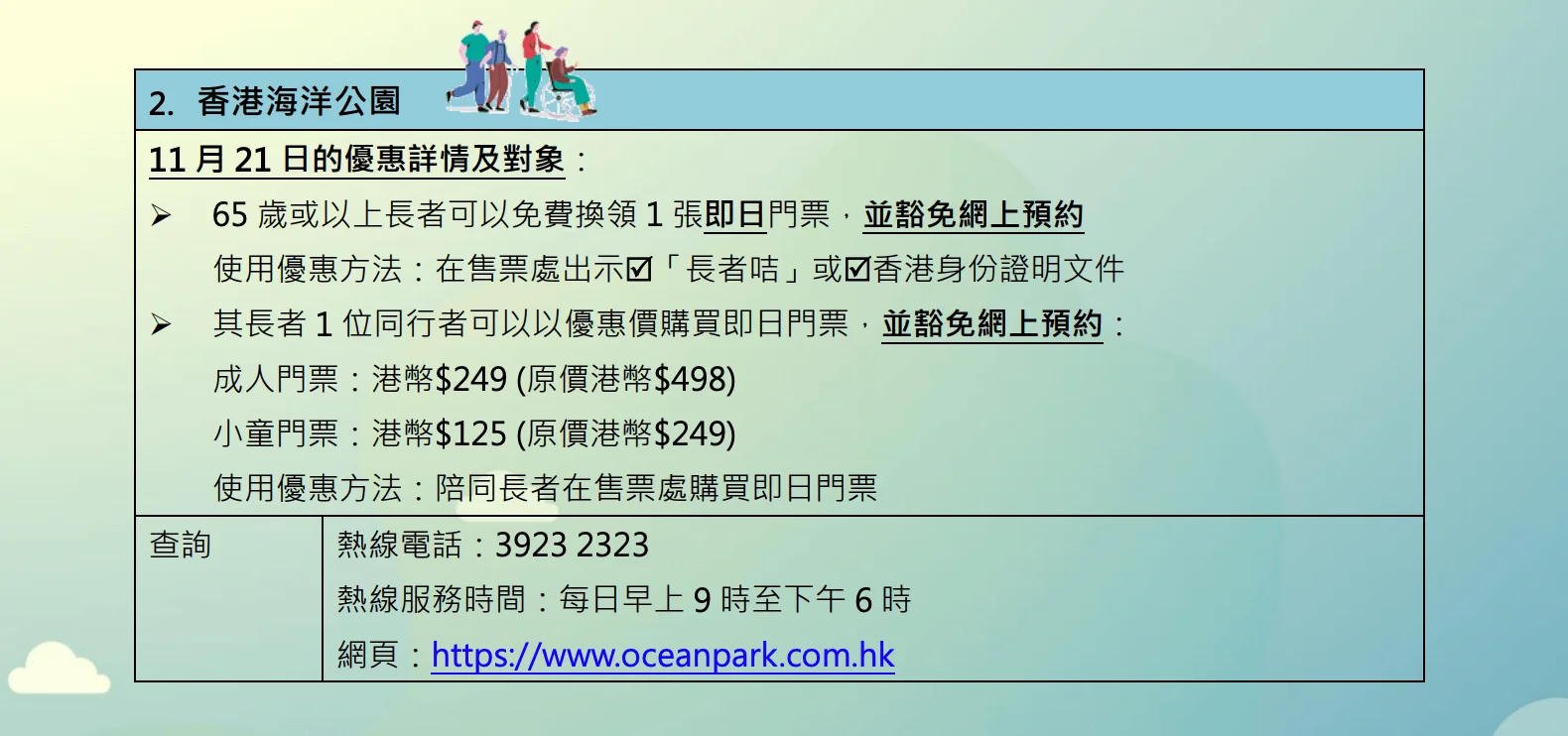 海洋公園也有免費入場優惠,長者可憑證明文件免費換領即日門票1張,而同行者也可使用優惠價購買門票。
