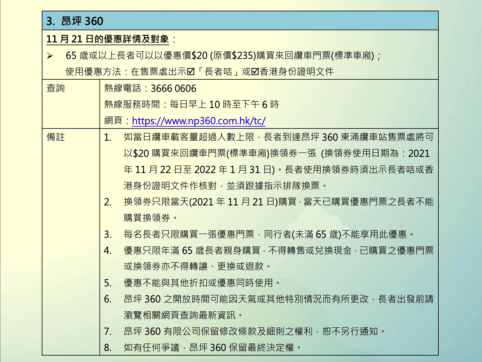 至於昂坪360則有門票折扣,長者可於售票處用優惠價20元購買來回纜車門票(標準車廂)1張。