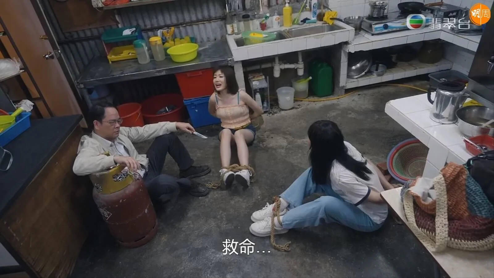 被綁起及挾持。