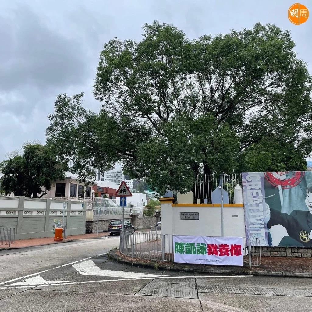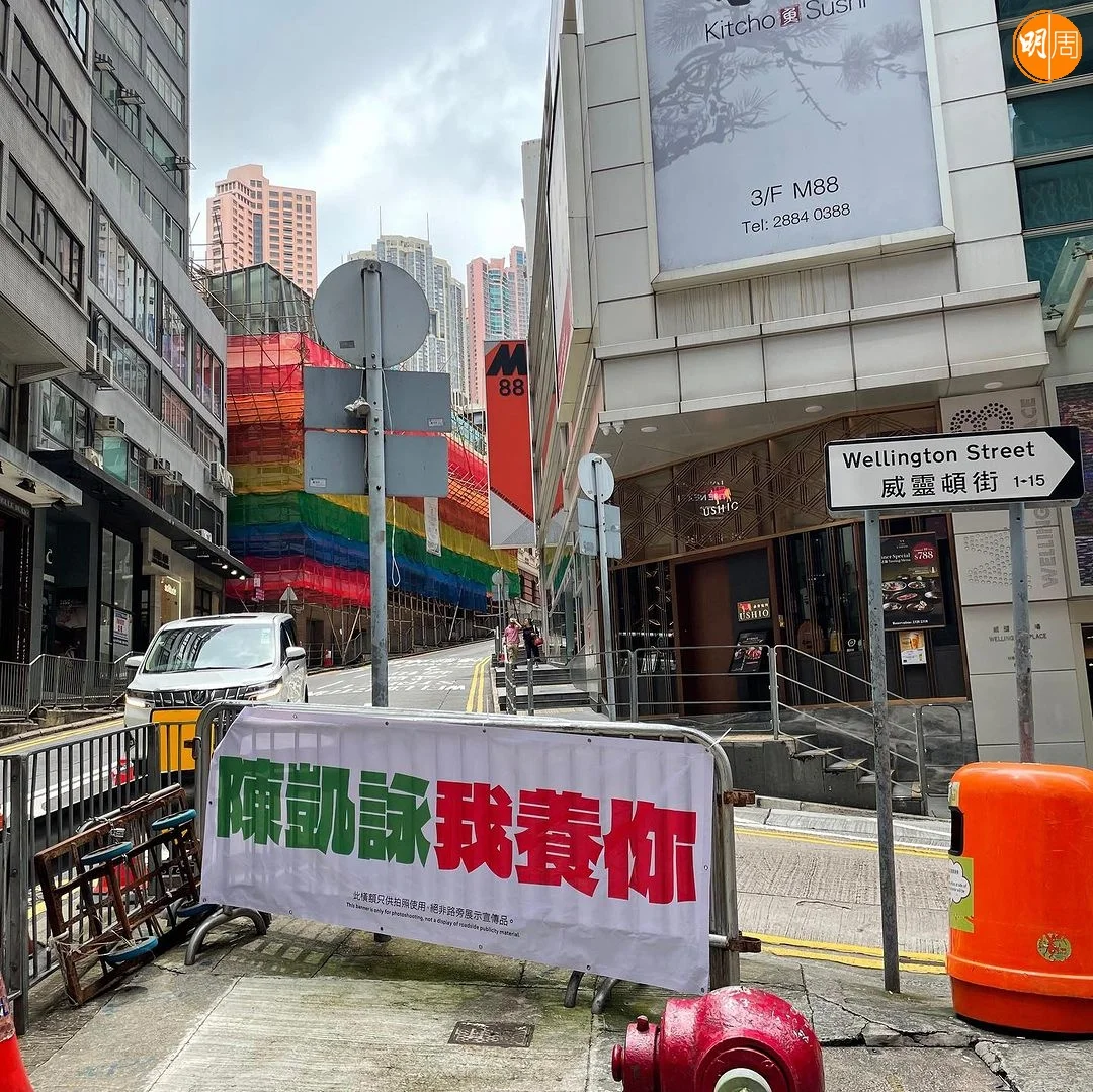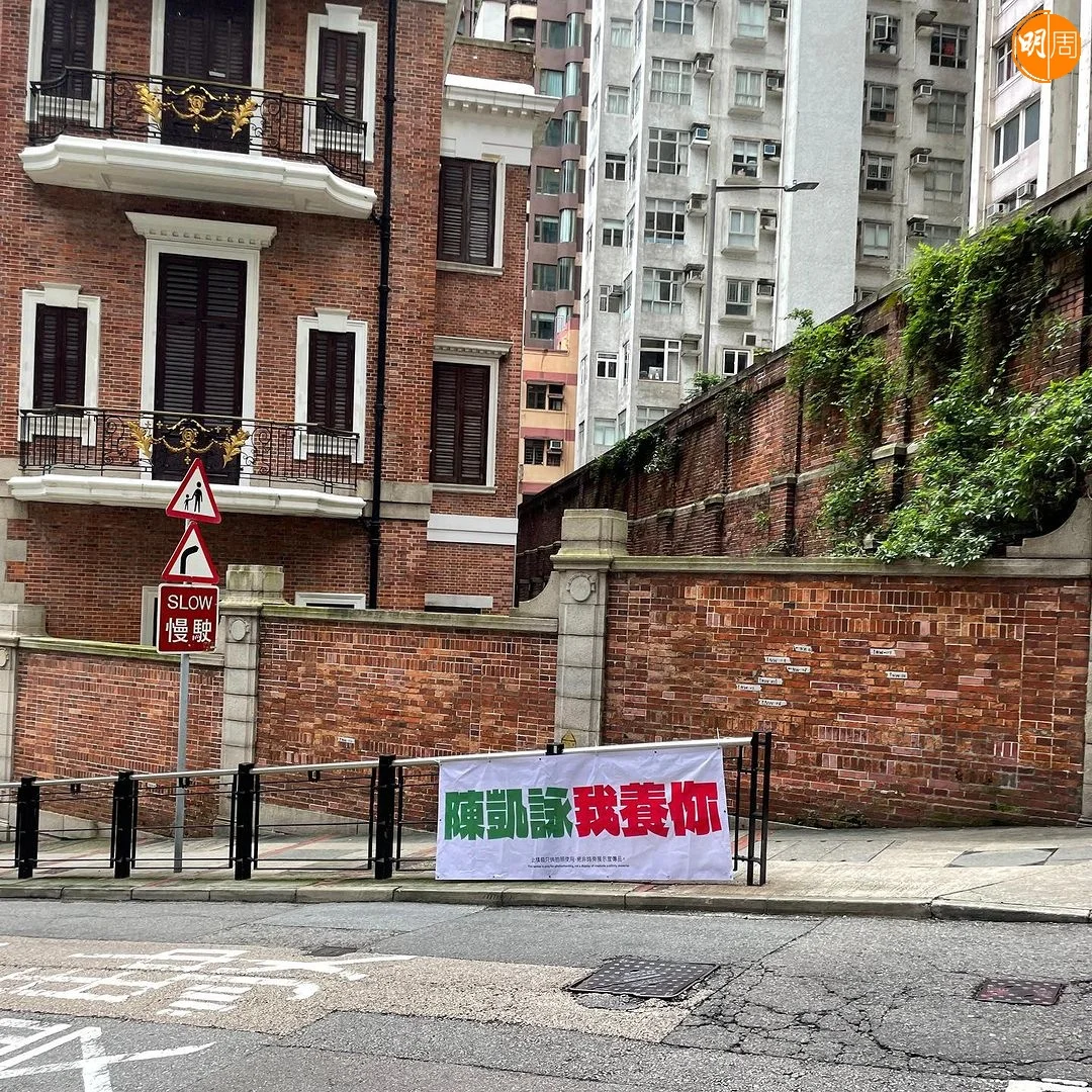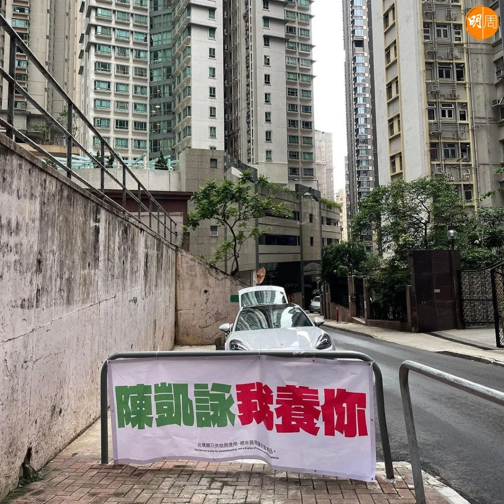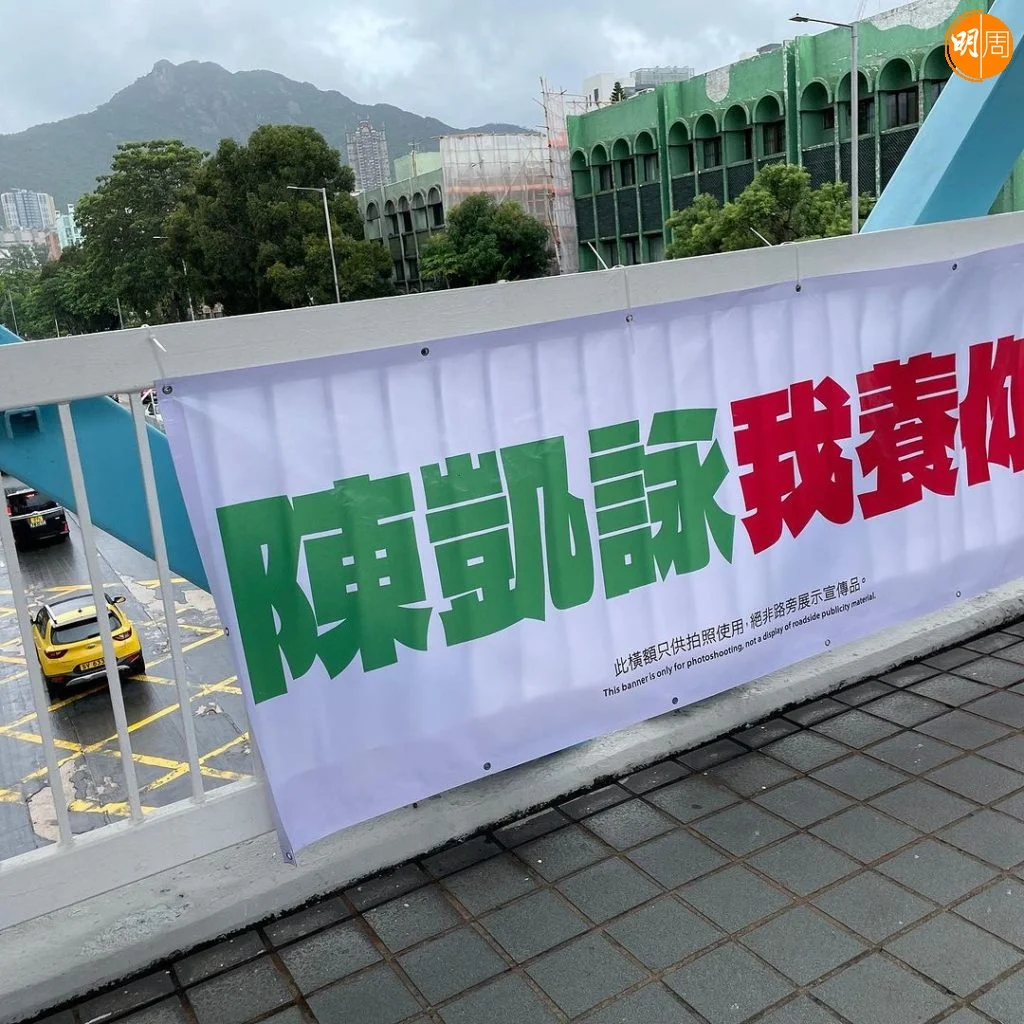 近日在中環及九龍塘等公眾地方,行人路旁的欄杆上掛出「陳凱詠我養你」字樣的大幅橫額,橫額底部更印有「此橫額只供拍照使用,絕非路旁展示宣傳品」。有網民拍下短片並分享到社交平台,又標註了陳凱詠(Jace),Jace則留下驚訝emoji。