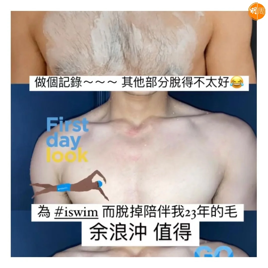 Jeffrey寫道:「世上哪有一步登天,那都是你默默在背後埋頭付出了別人不知道的努力。這個post想記錄一下自己23歲這麼赤裸的努力,也想鼓勵一下大家,我可以你也可以。話說從小到大都是一名胖子,這一兩年雖說完全瘦下來了,但是肚腩一直陪伴着我。知道拍游水要像運動員,起碼不能有肚腩,從無到有,從一大舊肚腩到6塊腹肌,決斷不靠任何人任何教練,只想靠自己的堅持做好這件事。」
