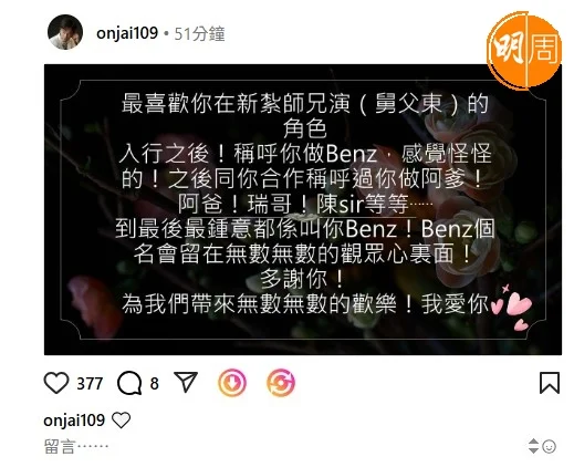 陳敏之:「Dear老竇,沒有想過…昨天在醫院是見你的最後一面。人生無常,由《覆雨翻雲》開始,我已經叫你做老竇,實在有太多回憶,你在天家再冇病痛,記住我約咗你,之後一齊食大餐。老竇RIP!」麥長青:「從『舅父東』、『大隻講』開始喜歡你,到訓練班出來同你拍第一套劇《兵權》而認識你,謝謝你用另類方法教我演戲,更謝謝你放飯時邀我一起帶着頭套坐上你的『Benz』去九龍城食飯,令一個新人沒有陌生感和孤立感…,到後來多次同你合作,你是一位好前輩、好師兄、好同事、好朋友,很想學習你的幽默感、搞笑和做人態度,當然還有你的演技,永遠記得你看似『行貨』但非常真誠的笑容…『老Ben』一路走好!永遠懷念你!」譚耀文:「Benz!你知道嗎,你嘅機靈、活潑是多麽令人妒忌與羡慕~好享受和你對戲,因為你總是做到有玄(弦)外之音,令人細味。 好爸爸,你雖然走了,但你要知道,有很多很多會繼續愛錫你,惦念你的!一路走好🙏🙏🙏」。