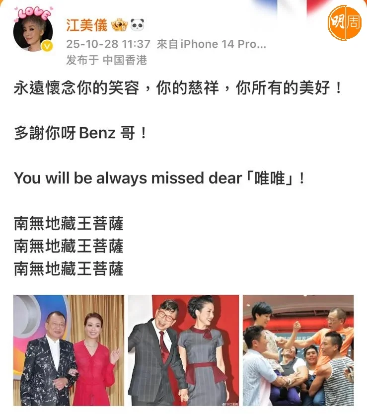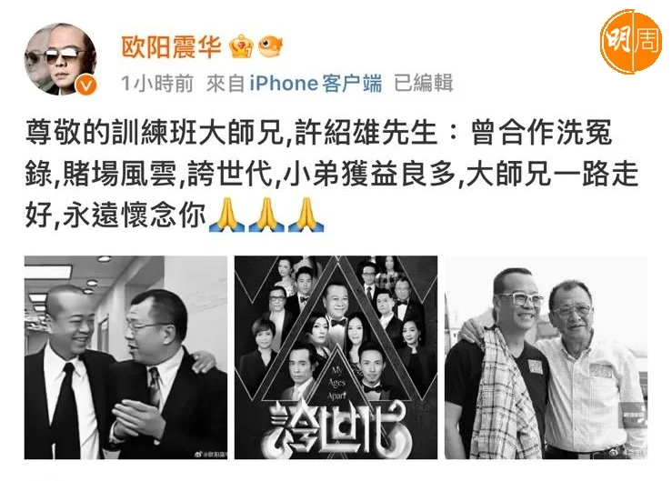 許紹雄離世,昨日(27日)未能趕到醫院見他最後一面的藝人,包括楊千嬅、周柏豪、吳業坤、羅敏莊、洪永城、湯洛雯、宣萱、吳若希、陳山聰、江美儀、徐榮、周勵淇、謝東閔、梁烈唯、林保怡、呂良偉、惠英紅、舒淇、胡杏兒、高海寧、蔡卓妍、林盛斌等,均有在社交網發文悼念。