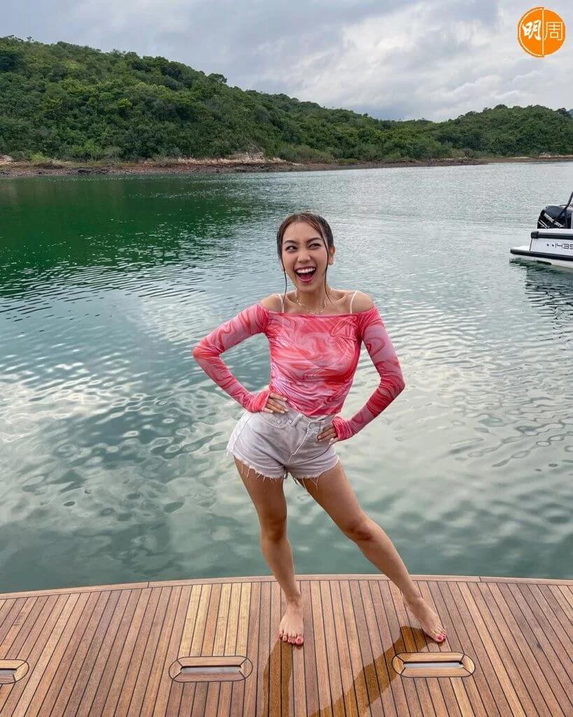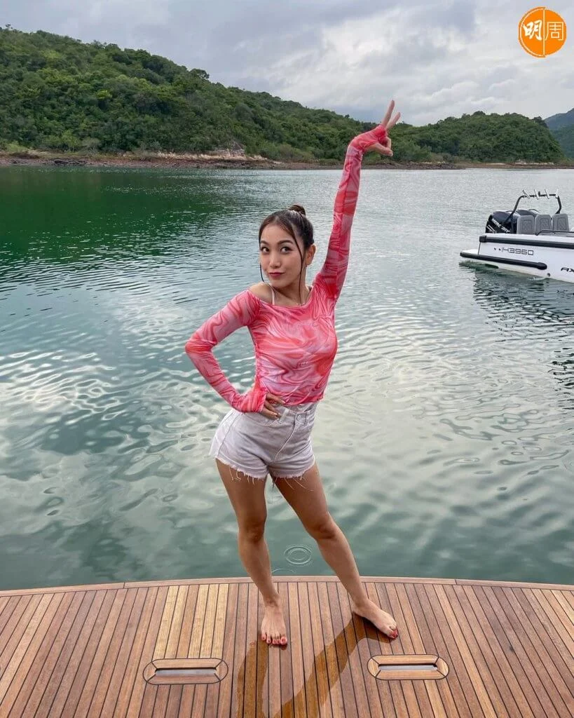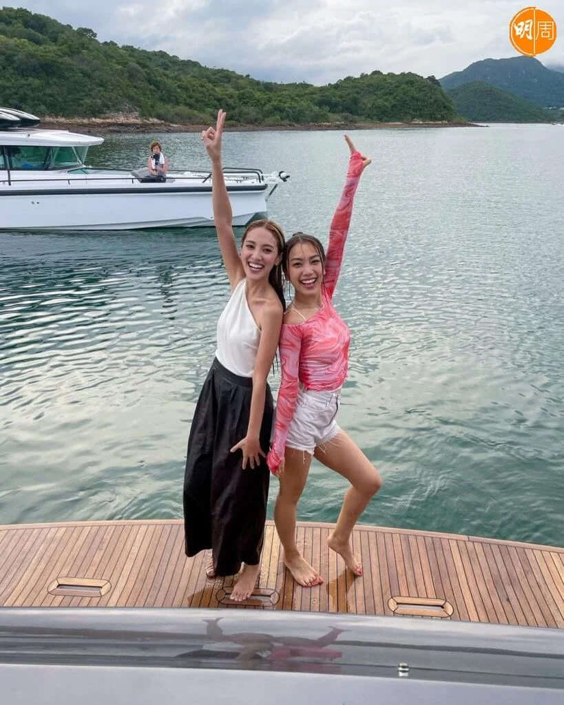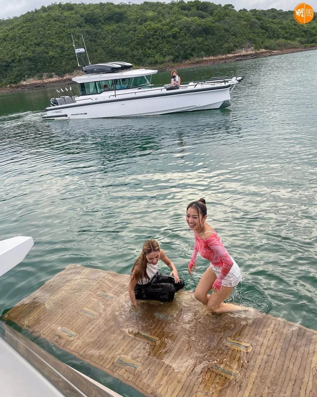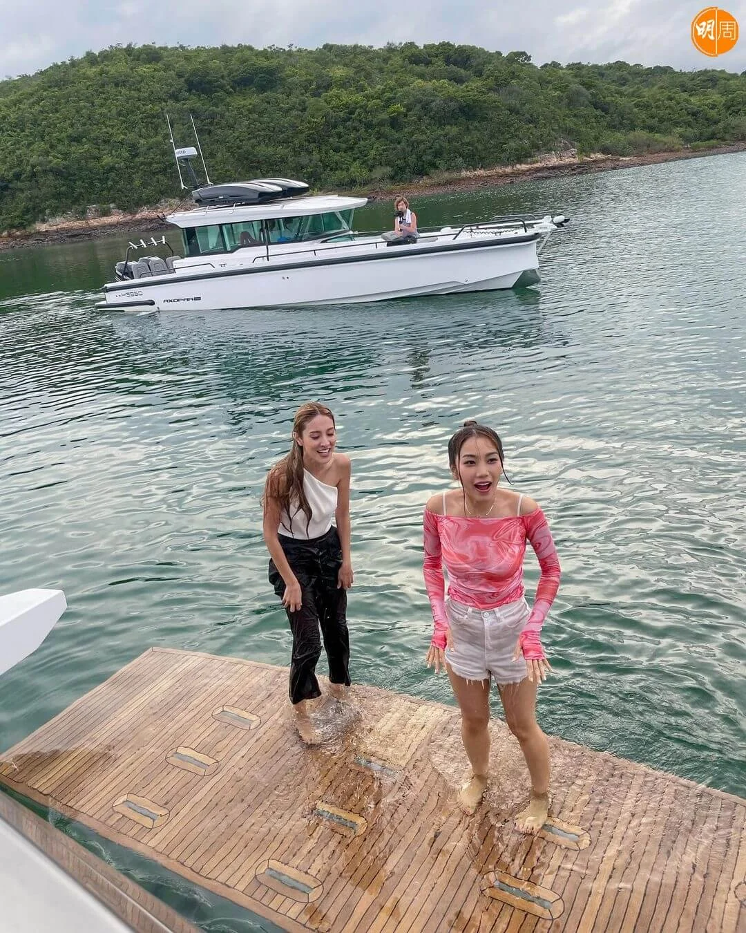 姜麗文(Lesley) 在社交平台貼上與陳凱琳(Grace)齊齊遊船河的照片,由於兩人同樣來自加拿大,鬼妹仔性格,故玩起來相當投契,相中兩人雖然都沒有穿上泳衣,但卻在遊艇旁的巨型木板上玩跳水,理所當然曾學跳水的Lesley,姿勢略勝一籌,難怪她風騷大擺趷籮甫士及高舉勝利手勢,更寫道:「讓我們開始跳躍吧,溫哥華女孩團結起來,自發一刻。」