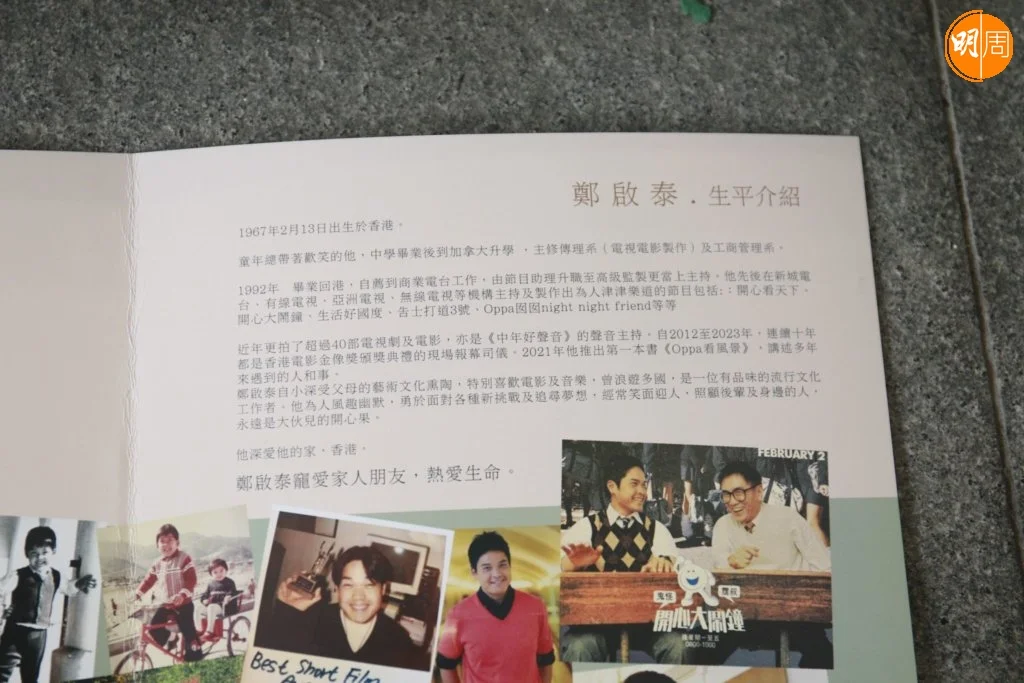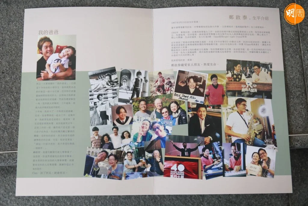 大會在場內派給到場參與人士一本場刊,標題為「鄭啟泰 開心看天下」,內容除有鄭啟泰生平介紹外,當中有一段鄭啟泰女兒Kayla所寫的「我的爸爸」文章,她憶起與爸爸的生活點滴,並指爸爸不想她像自己一樣捱苦,不想她做娛樂事業外,Kayla寫道:「轉眼間,我還有數個月就大學畢業了。沒想到,你竟然要搶先比我更早畢業。還未等到你參加我的大學畢業禮,我就要參加你的人生畢業禮。謝謝你這21年來的陪伴。Ciao,說了再見,就會再見。」