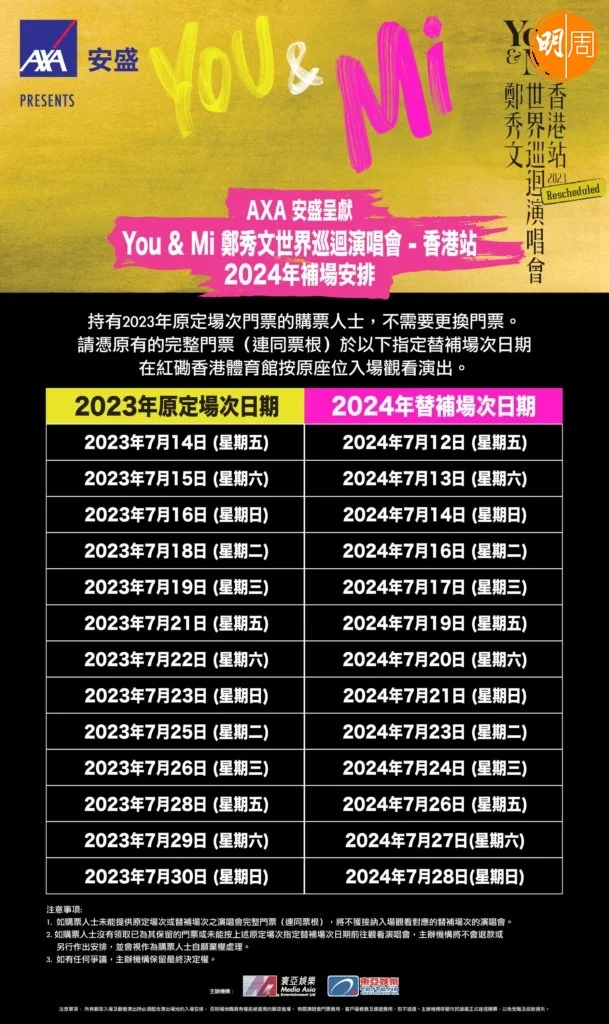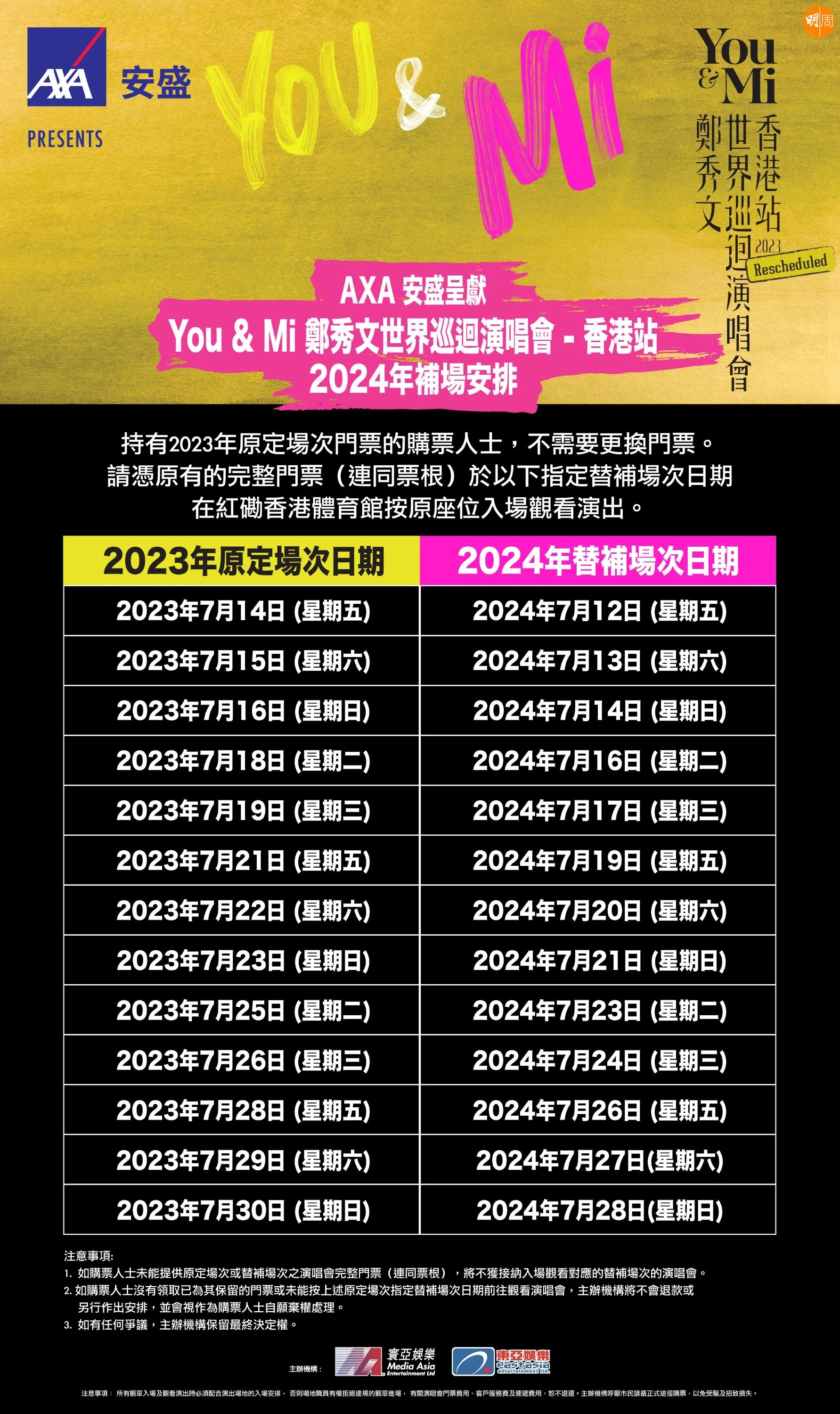 鄭秀文(Sammi)去年因受長新冠影響,原定2023年7月在紅館舉行的13場演唱會宣布延期,並於同年11月發布補場消息,落實於2024年7月12日開始舉行。
