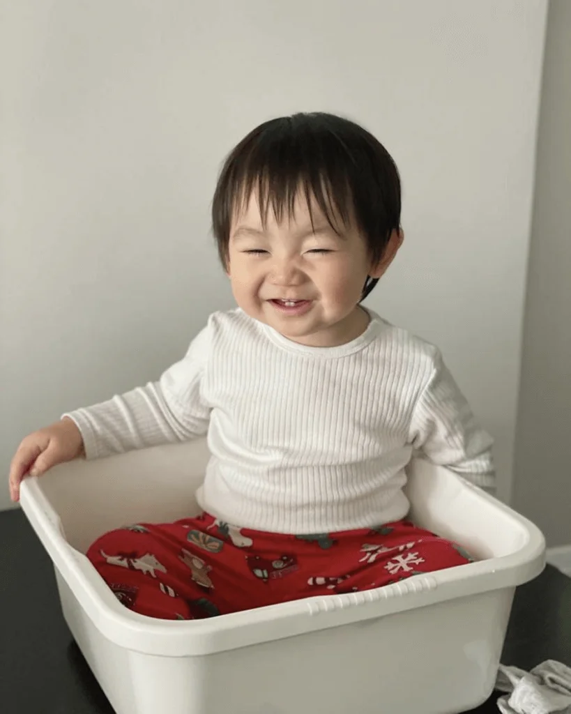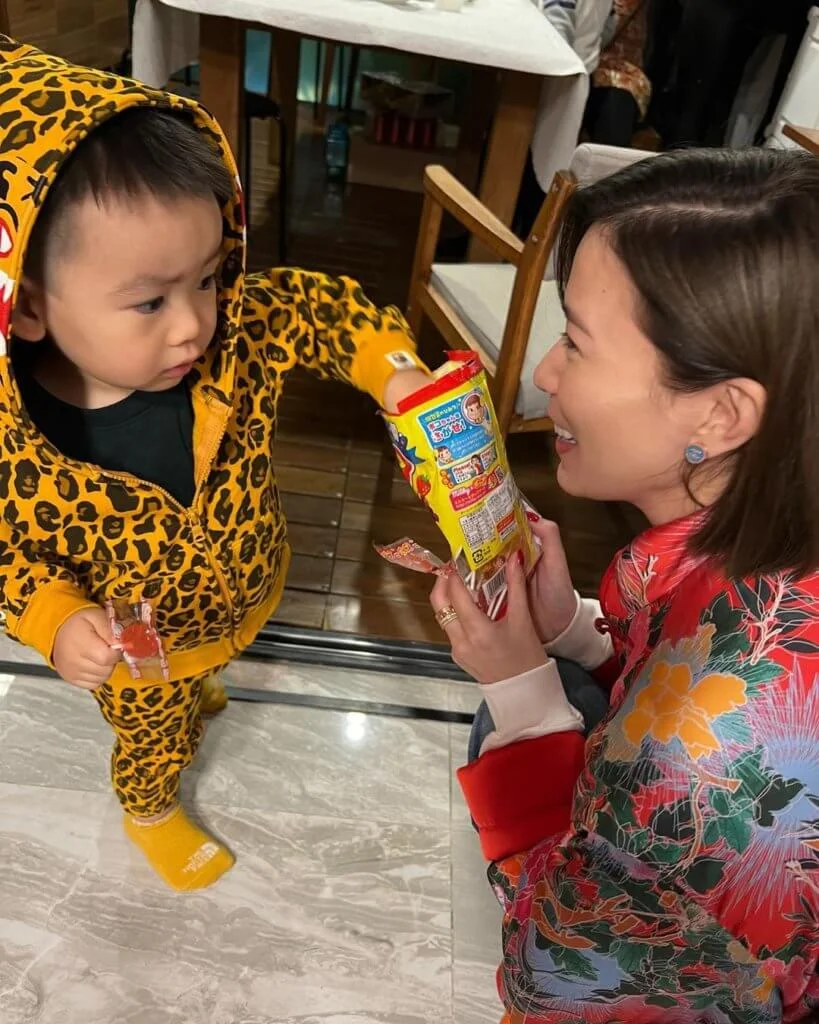 梁靖琪(Toby)在社交網上載兩張照片,笑指佘詩曼身為仔仔契媽,竟然為了達到目的而不擇手段,照片中阿佘給兩歲大的契仔Roman吃零食,原來她用糖利誘對方,要求Roman叫聲契媽便給零食,Roman就用「BB話」:「Ai Ma,糖糖!」阿佘得逞後,即露出開心笑容。