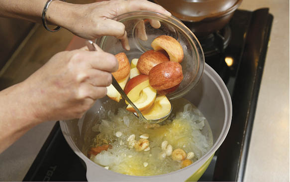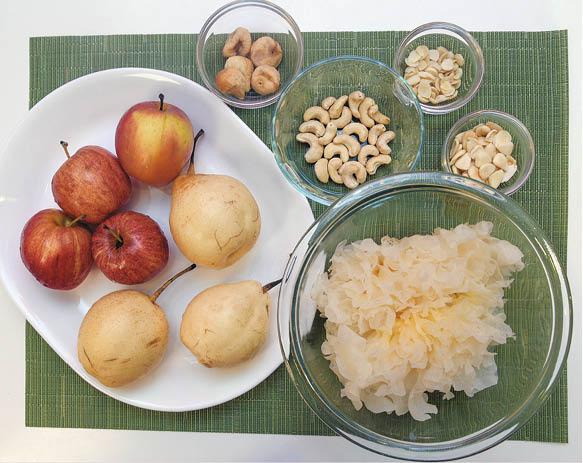 材料:蘋果四個、雪梨三個、雪耳二個、無花果四粒、腰果適量、南北杏適量