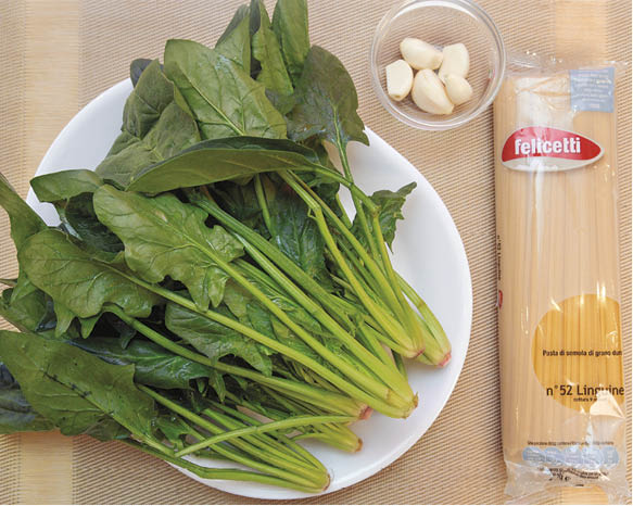 材料:菠菜半斤、意大利粉適量、蒜頭適量