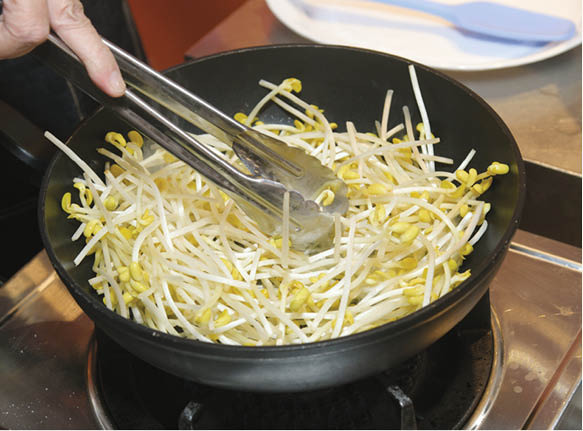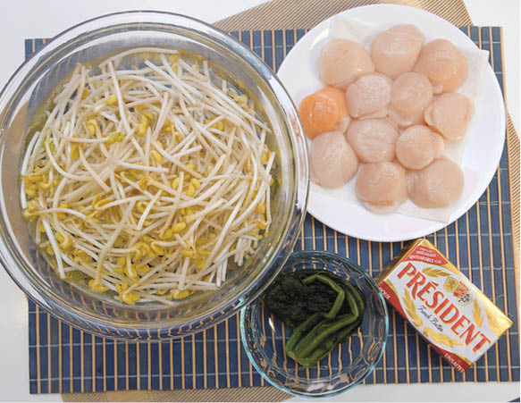 材料:北海道帶子十二隻、大豆芽一斤、雪菜適量、牛油少許