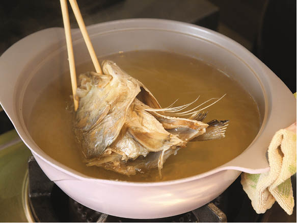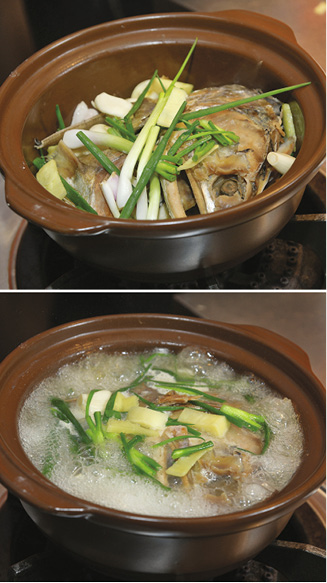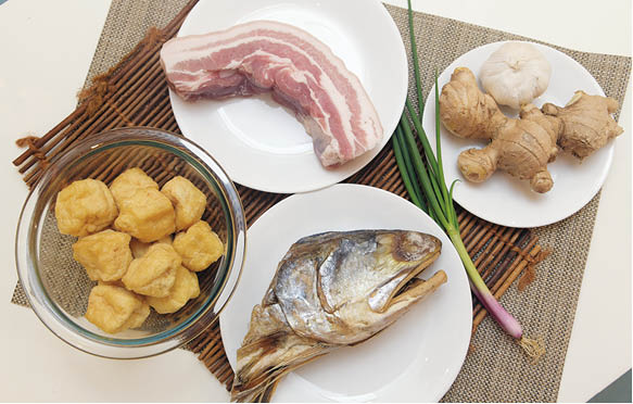 材料:鹹魚頭一個(大魚)、五花腩一條、豆卜適量、薑多片、蒜少許、葱適量