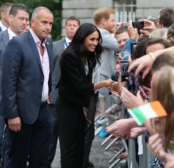 至於今次與哈里到訪愛爾蘭,大概活動性質較輕鬆,梅根的表現都明顯更從容,不時展現燦爛笑容,又主動同民眾傾偈,連衣著打扮都轉而穿回自己喜愛的風格,重回暗沉色系的懷抱,其中一日更以西裝示人。不過最令人喜出望外的,是梅根不嫌避與民眾笑談自己的演藝事業!事緣梅根與哈里參觀完當地博物館後,與守候在外的其中一名女性Fiona Moore傾偈,Fiona自言好鍾意梅根主演的美劇《金裝律師》(Suits),更表示好掛住有她參演的日子,估唔到梅根好開心咁話自己都一樣好懷念當時拍劇的日子。《金裝律師》由2011年起啟播,梅根飾演一個為公義發聲的正義律師,在劇中更有不少大膽的性感演出,劇集為梅根贏得知名度,雖然今日的她早已退出劇集,未來的日子亦不可能再拍劇,但梅根的回應仍然令一眾劇迷非常興奮!