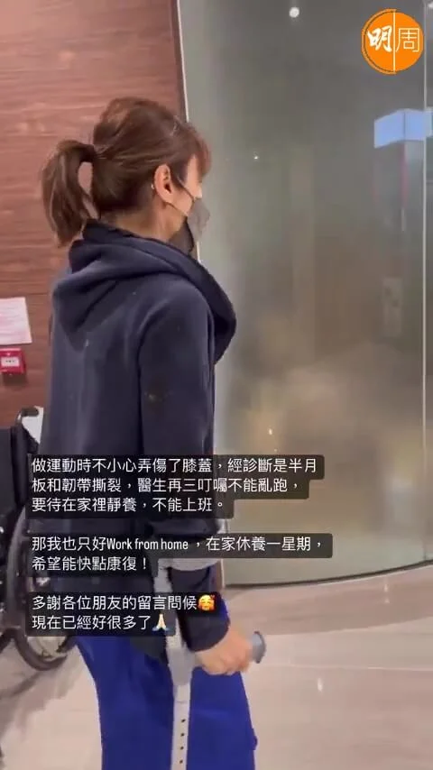 今日黎姿再上載撐拐杖去醫院睇骨科的片段,並揭盅:「做運動時不小心弄傷了膝蓋,經診斷是半月板和韌帶撕裂,醫生再三叮囑不能亂跑,要待在家裏靜養,不能上班。那我也只好Work from home,在家休養一星期,希望能快點康復!多謝各位朋友的留言問候,現在已經好了很多了!」