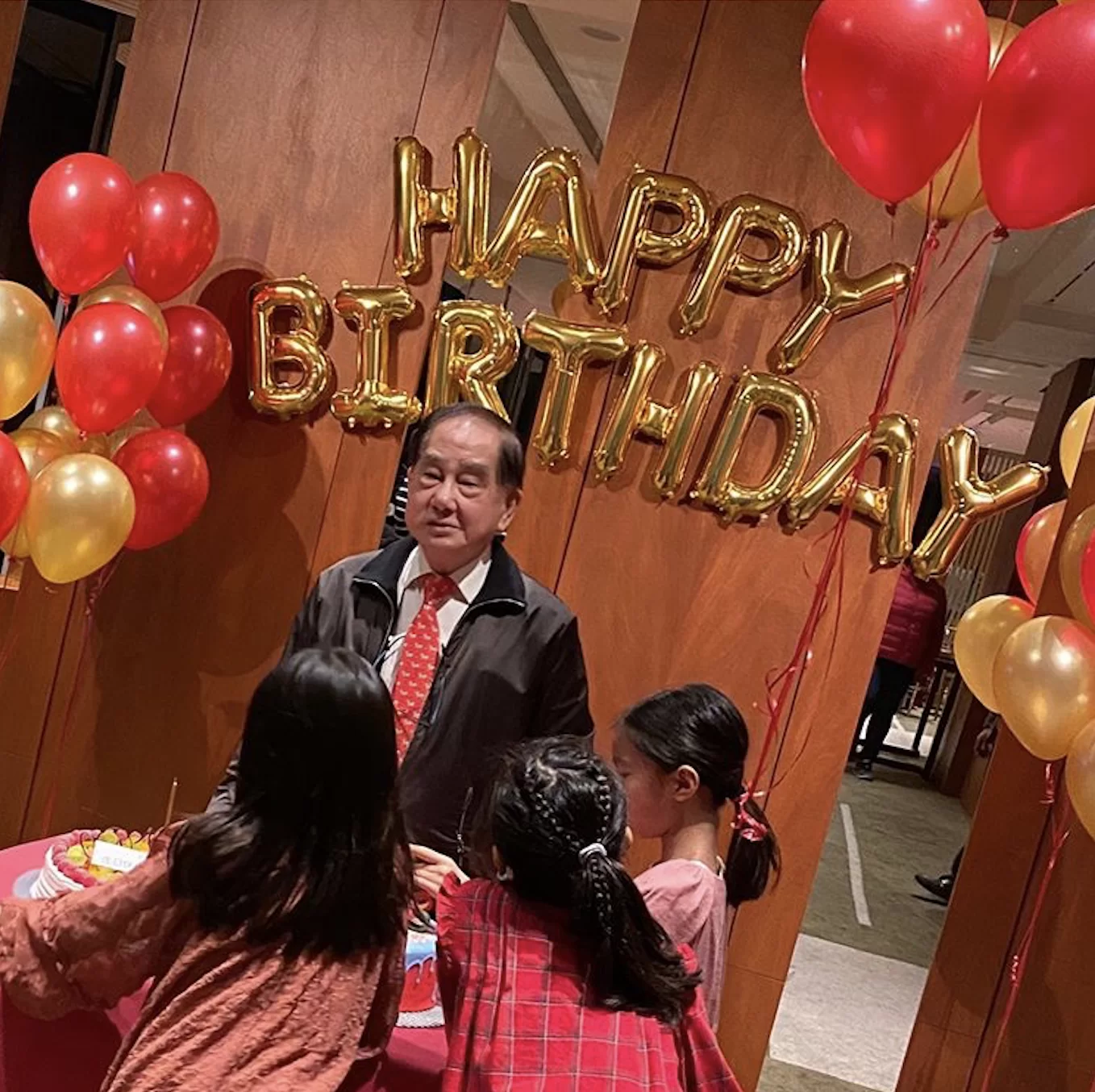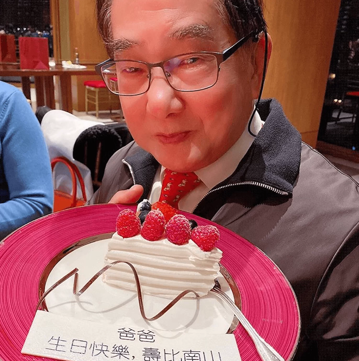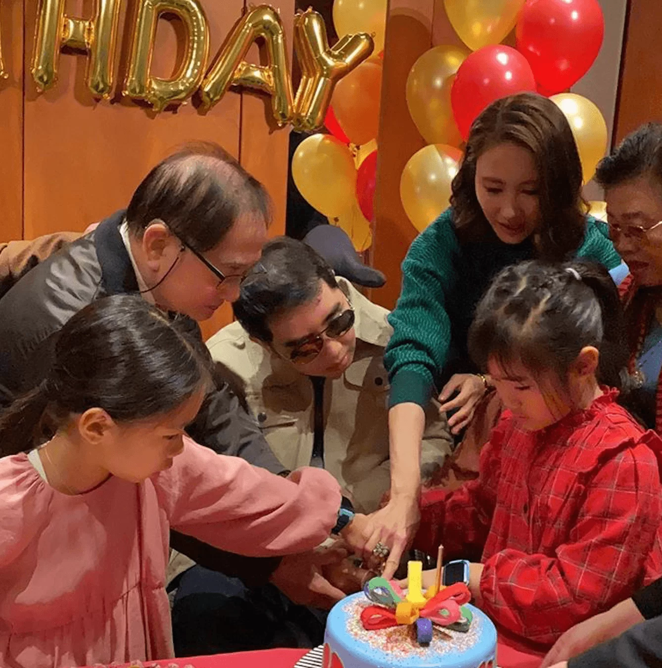 Gigi在社交網分享多張照片,見三個小朋友溫柔握着公公的手切蛋糕,相當孝順。其後Gigi舉起寫着「爸爸,生日快樂,壽比南山」的蛋糕牌與爸爸合照,露出燦爛笑容。