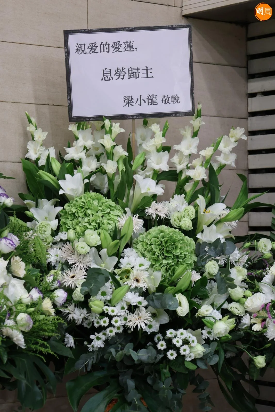香港60、70年代著名歐西流行曲女歌手黎愛蓮(Irene Ryder)9月1日離世,享年75歲,今日(4日)在九龍殯儀館設靈,採天主教儀式進行,靈堂佈置簡潔,遺照是黎愛蓮曾經推出的唱片內頁照,愛女Anne的白色心形花牌放在露堂前正中位置。圈人好友包括前夫梁小龍、賈思樂、黃淑儀與老公徐景清、鄧光榮太太(Janet Tang)、邱禮濤、香港演藝人協會等均有送上花牌悼念,其中梁小龍的花牌以「息勞歸主」送別前妻。