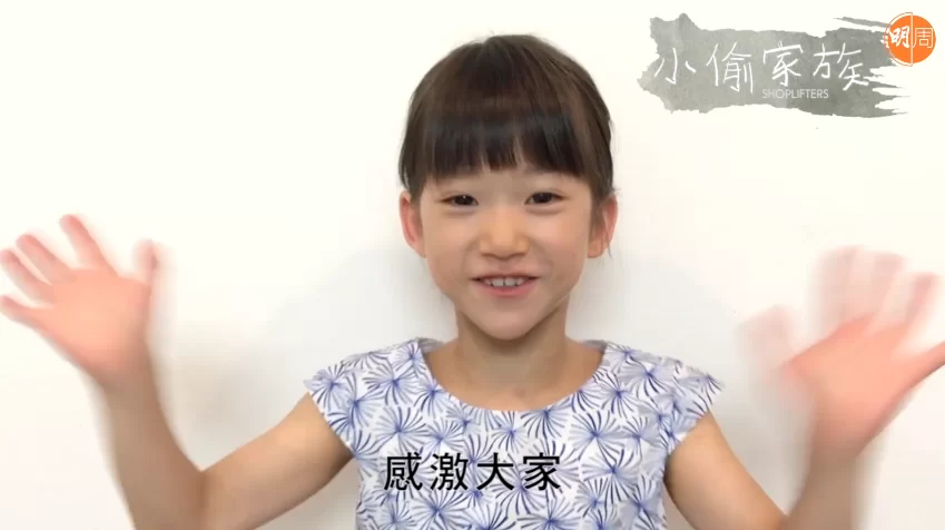 戲中飾演妹妹的佐佐木光結只得六歲,但演技自然,對住安藤櫻、Lily Franky及樹木希林等實力派都沒有怯場。年紀小小的她即使拍攝期間甩牙,亦毫不介意,反而經常甜笑,被外界大讚演技出色兼搶鏡。這得意妹每次出席宣傳活動更成為大家的焦點,繼早前親自畫畫同做勞作送給導演是枝裕和及一眾演員後,佐佐木光結亦好今次她好識做,親自拍片多謝香港影迷支持,更以廣東話講「大家好」同「多謝」,真係好可愛!