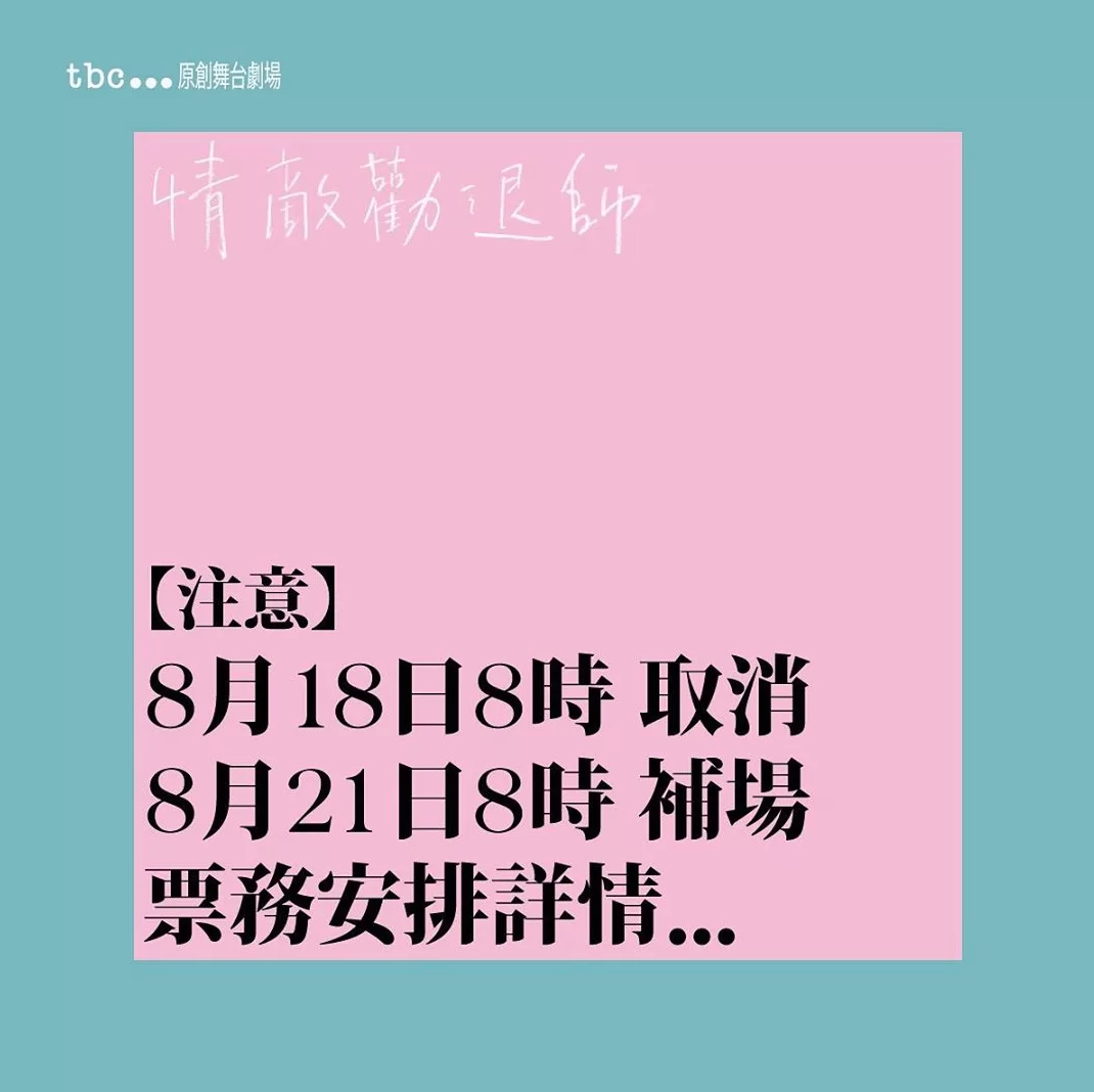 另外,由蔡卓妍(Sa)及卓韻芝合演的舞台劇《情敵勸退師》於上星期舉行首演,不過阿Sa今日在網上貼文,表示基於觀眾的安全及交通問題,8月18日晚上8時的演出延期至8月21日晚上8時,當日觀眾按門票印的座位編號就坐;大會又指可安排觀眾更換其他場次的門票,並稍後公布退款安排。