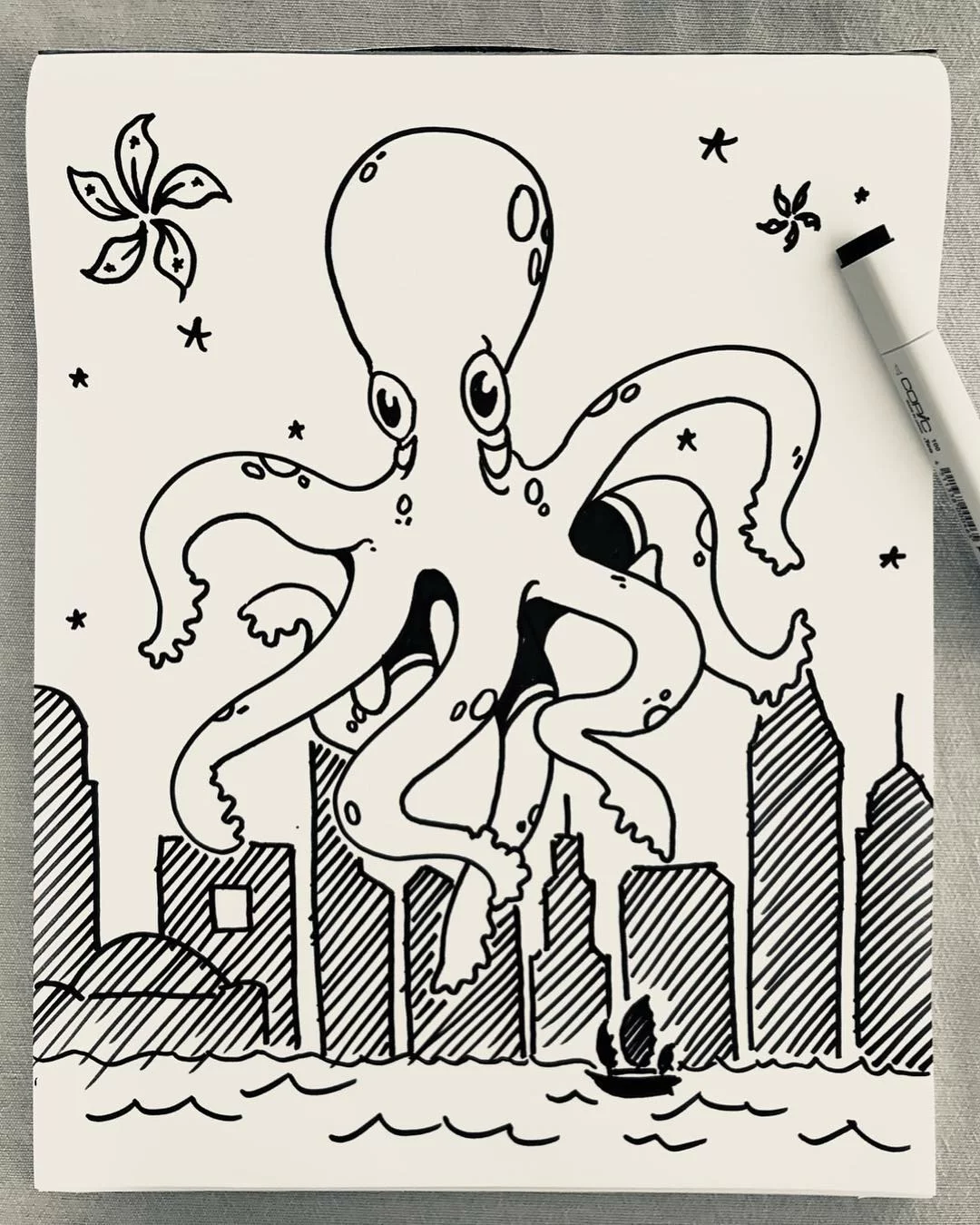 Mike日前已在社交媒體貼上一幅手繪畫作,當中隱約看見維港高樓大廈的景色、洋紫荊的圖案及一隻巨大的八爪魚,昨日他正式公佈8月7日舉行香港個唱。