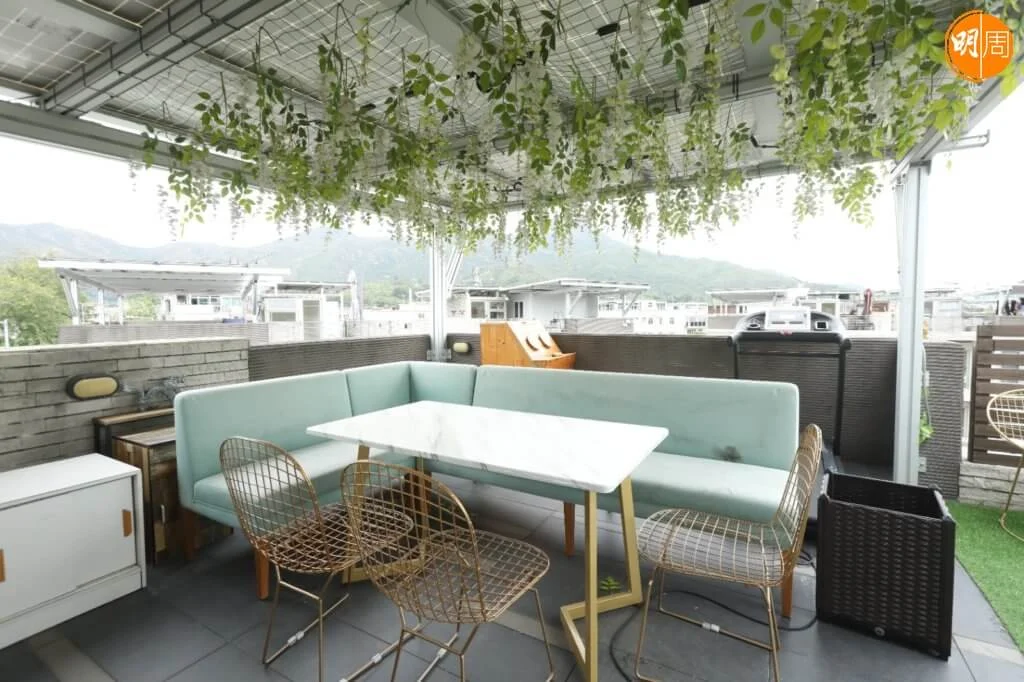 主人房設置一個巨型投影器,睡前兩夫妻可以看齣電影,輕鬆一下,但她笑言唯一的私人空間也被女兒霸佔來看卡通片,「大女兒會說跟爸爸看電影很chill,牀上亦放了二人的枕頭,生一個女兒失去半個老公,生三個女就失去一個半老公,現是負半個。由於二、三樓已沒有我的空間,我要延伸去四樓天台,老公設計了一個小花園,讓我跟朋友聚聚,不過事前不能告知女兒,要不然她們又要參與,我要扮不在家裏,才有三、四小時me time。」