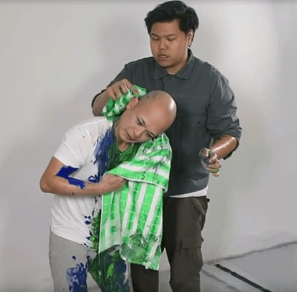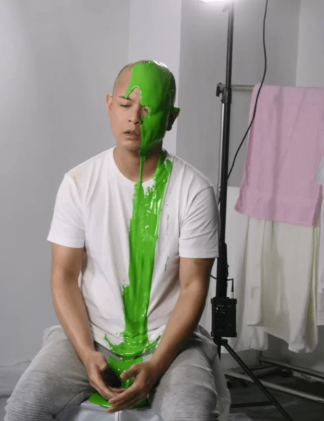 當時並沒有沖身的地方,Justin只能用水桶清洗顏料,問到他的皮膚會否敏感,Justin表示:「初頭冇,只係覺得好凍,一堆堆嘢撻咗落個頭再流落身,拍完之後,先發覺頸起咗一粒粒紅點,化妝師話有少少敏感,不過,拍得好乜都冇所謂啦!」MV花了4小時便完成拍攝,Justin笑稱:「話就話一take過,淋嘅時候個位唔啱,啲漿流得唔好睇,都係一路補一路淋,愈淋愈興奮,搞到我真係好似變態咁。」