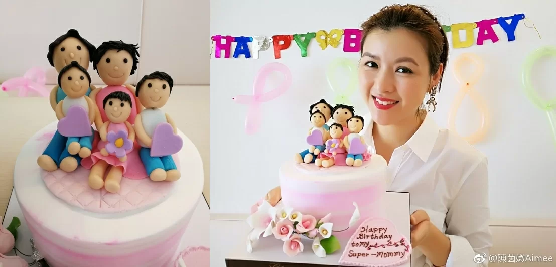月初生日的Aimee獲老公陳豪送上家庭造型的生日蛋糕。(微博照片)