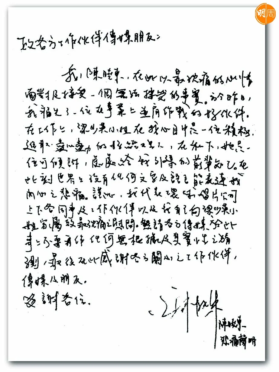 2000年1月12日,陳曉東(東東)的經理人梁少英(Rebecca),於粉嶺寓所跳樓身亡,享年32歲,消息震驚娛樂圈。警方指出,死者在住所遺下一張巨額支票,並寫下數句遺言,交代親戚代為照顧雙親。事發後,Rebecca的父親也向警方透露,女兒近日心事重重,本來活潑開朗,卻變得不喜歡說話,透露過因為工作壓力,很多事都拋不開。