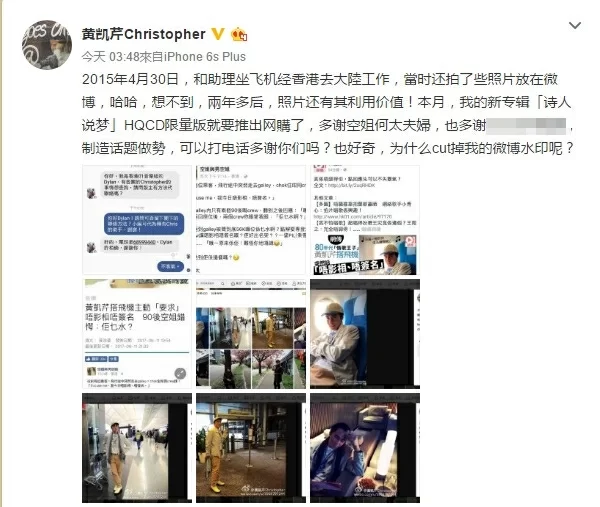 在加拿大定居的黃凱芹 (Christopher)今個月終於推出新專輯《詩人說夢》,理應值得高興,不過近日Facebook專頁「空姐與男空姐」上載了一個關於「而我不知道黃凱芹」的帖文,文章講述Christopher主動走到機艙廚房向機艙服務員表示「今天不拍照、不簽名。」黃凱芹昨晚至今天在個人微博連續出post還撃,聲稱該文章的照片是他在2015年在內地航空公司的小飛機上拍的,這班客機不出現在國泰航空公司的行程中,還反問文章的作者「林太」的全名及或公司編號,「好奇想去問一下當天你們的當値表」,暗示文章內容不實。
