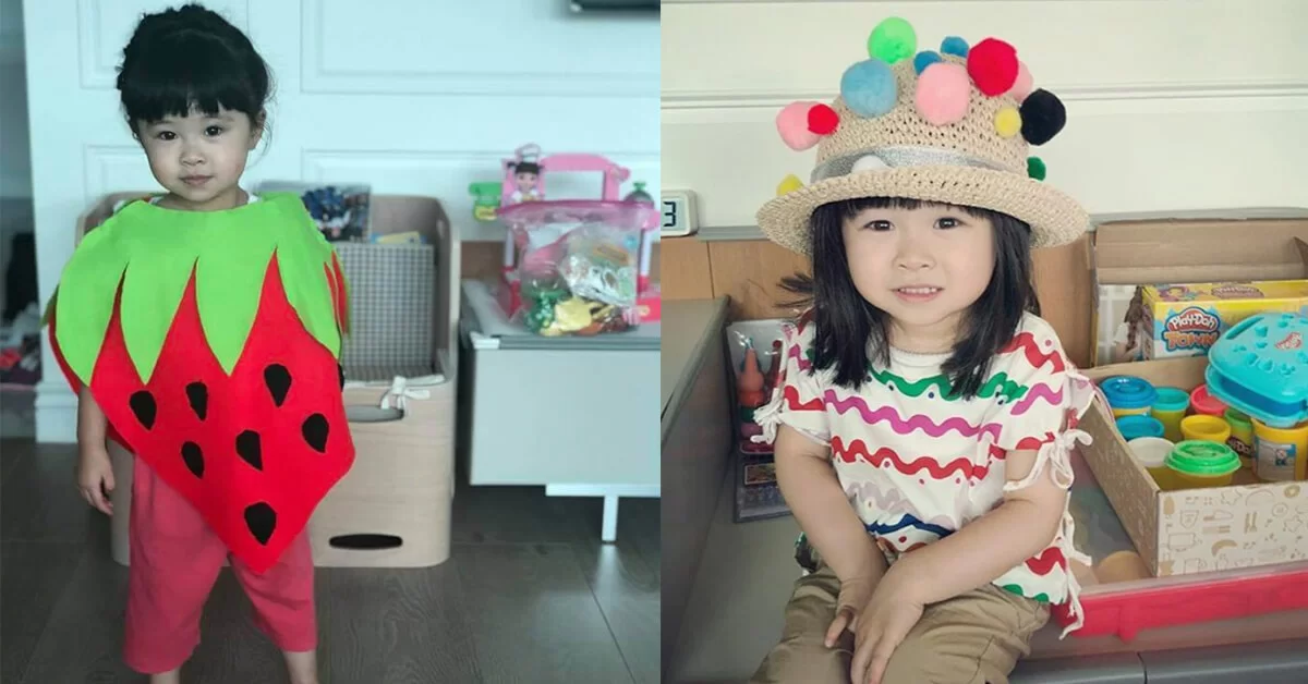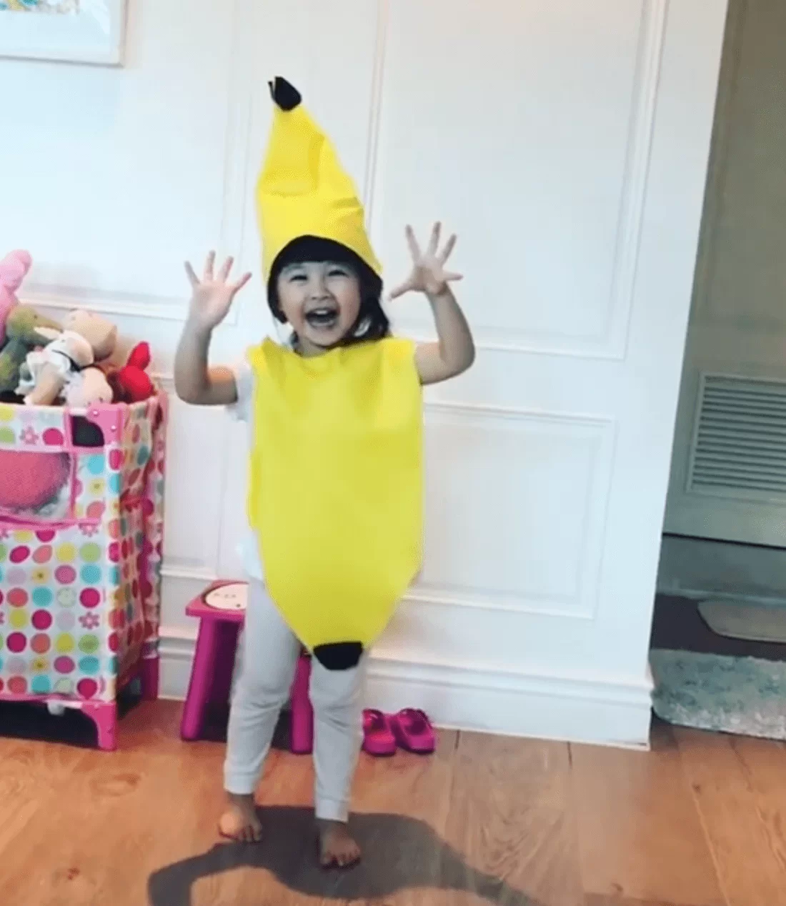 Jade分享囡囡穿香蕉服的影片,並寫道:「Jovia K1新學期第一個大project 就係做蔬菜水果服,媽咪梗係同佢DIY啦!記得上年做咗佢至愛嘅士多啤梨,今年心心話要做香蕉,因為佢係Monkey喎!心心著咗件香蕉服之後仲即興作咗隻香蕉歌,大家聽下睇鍾唔鍾意?」片中見心心頭上頂着香蕉帽,兩肩披着黃色布塊,她興奮得舉起勝利手勢轉圈圈,又大唱自創的香蕉歌,可見她十分喜愛媽媽為她做的水果服。