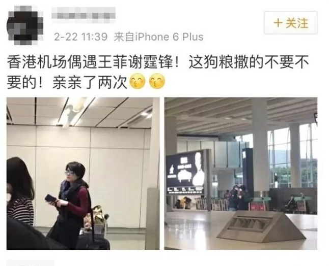 王菲和謝霆鋒自從在2014年世紀大復合後,一舉一動都成為網民焦點,今日有網民表示自己中午在香港機場巧遇王菲和謝霆鋒,王菲一如以往的型格,而謝霆鋒戴著墨鏡在一旁等候,但兩人到了大廳之後,謝霆鋒拉住王菲的手臂,雖然對方戴上口罩,謝霆鋒疑似獻吻。該網友更留言︰「這狗糧撒的不要不要的,親親了兩次」,當眾大曬恩愛,實在太閃了。