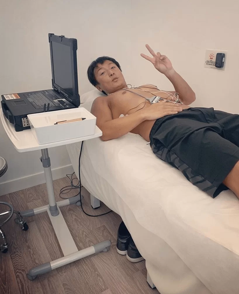 Alex今日(11日)貼出檢查心臟的照片,見他開心舉起勝利手勢。小方寫道:「美國太空總署NASA用作監測太空人心臟功能的科技,10分鐘就能完成測試,唔攰又唔痛。得出結果:我的心地夠好,可以挑戰45公里環島泳,阿媽放心啦!」