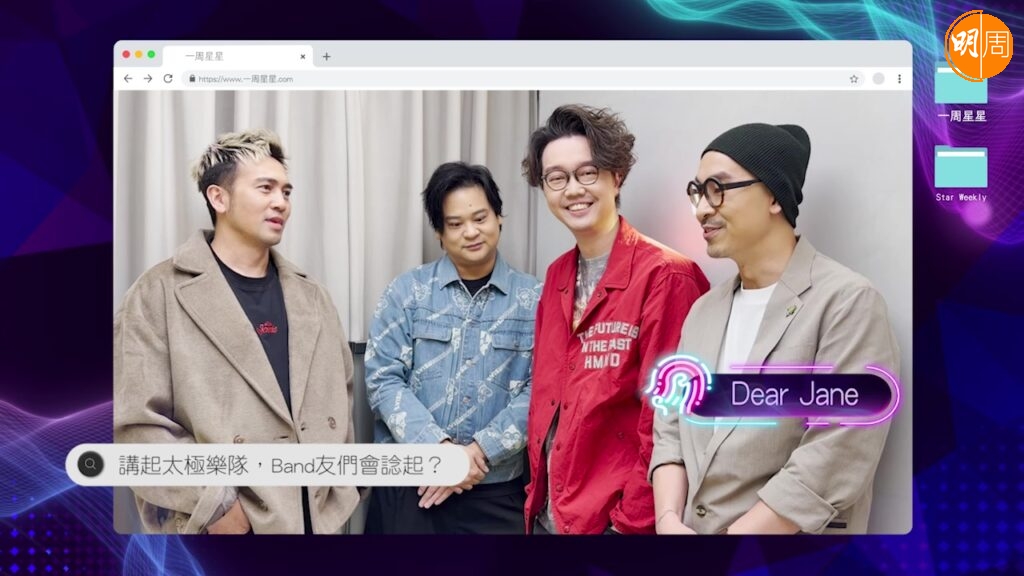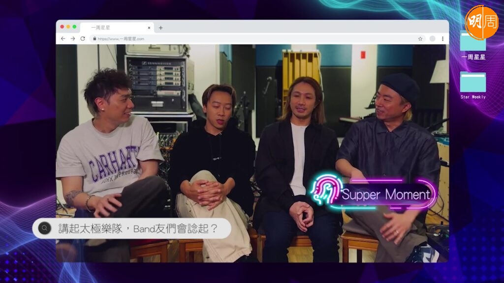 TVB娛樂訪談節目《一周星星》今晚(8日)播出第13集,迎來重磅嘉賓——成軍40周年的太極樂隊!五位成員鄧建明(Joey)、雷有輝(Patrick)、盛旦華(蛇仔)、劉德賢(HiFi德)及朱翰博(Ricky)齊齊亮相,接受主持許文軒專訪,暢談四十年兄弟情,更即場獻唱四首經典金曲,搖滾熱力震撼全場。