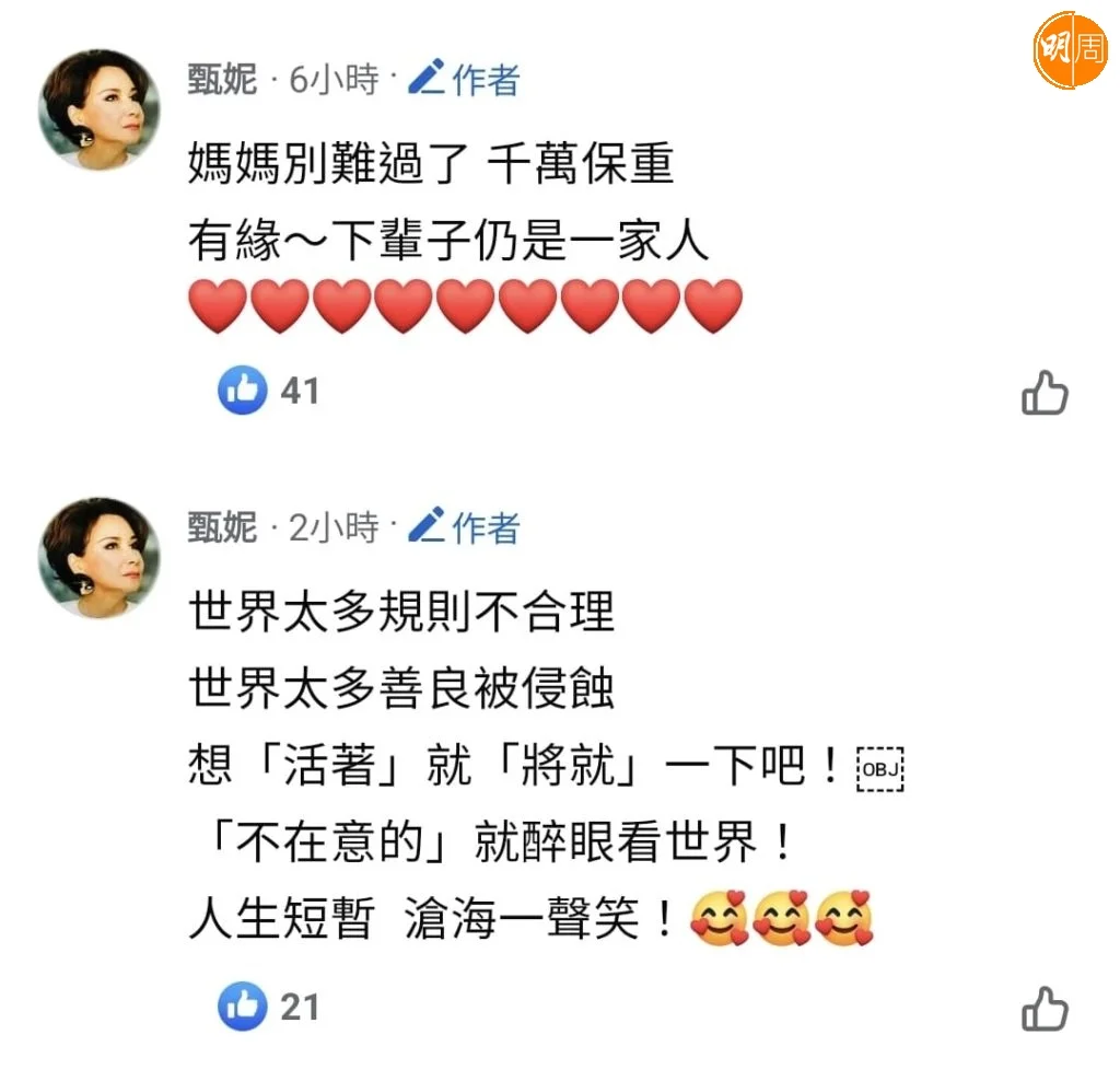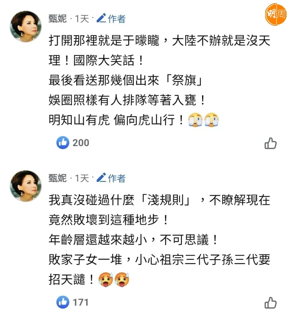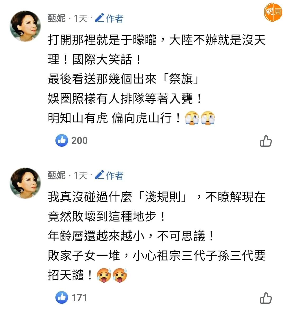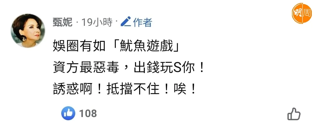 而有「樂壇風紀」之稱的甄妮,昨日(22日)起接連發文留言談及事件,甄妮以灰底白色發文「荒謬世代 自取滅亡」,接連留言抨擊潛規則風氣指「不瞭解現在竟然敗壞到這種地步!」亦直指無解又無奈:「改變不了,好無助!」甄妮更直指娛樂圈有如《魷魚遊戲》般黑暗,出錢便可玩弄人。
