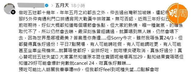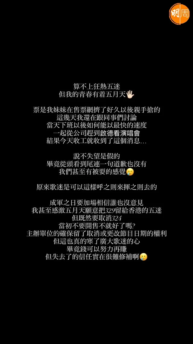 《東張》女神梁菁琳原來也成為今次的受害者,她在ig限時動態帖文:「算不上狂熱五迷,但我的青春有着五月天。票是我妹妹在售票網擠了好久以後親手搶的,這幾天我還在跟同事們討論,當天下班以後如何能以最快的速度,一起從公司趕到啟德看演唱會。結果今天收工就收到了這個消息……。說不失望是假的,畢竟從頭看到尾連一句道歉也沒有,我們甚至有被耍的感覺。原來歌迷是可以這樣呼之則來揮之則去的。成軍之日要加場相信誰也沒意見,我甚至感激五月天願意把329留給香港的五迷,但既然要取消324,當初不要開售不就好了嗎?主辦單位的確保留了取消或更改節目日期的權利,但這也真的寒了廣大歌迷的心,畢竟錢可以努力再賺,但失去了信任實在很難修補啊」!