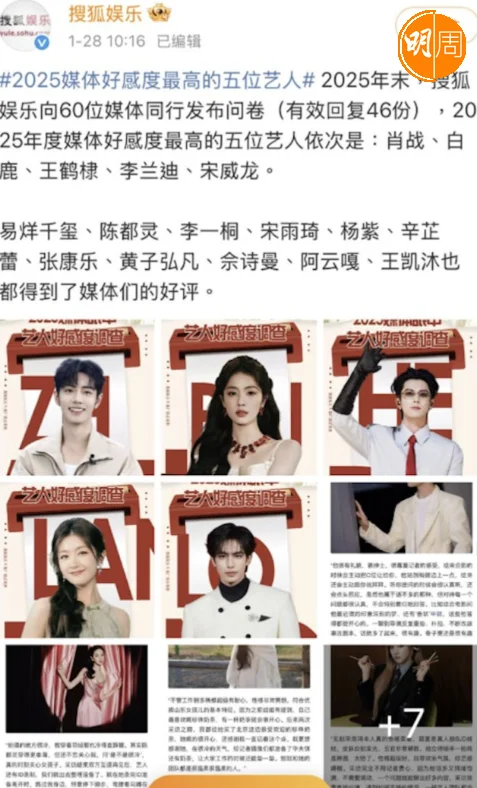 另外,阿佘獲稱讚為人有禮和藹、表裏如一,為「親和力滿分的新聞女王」!除了阿佘外,今次問卷調查中,媒體好感度最高的五位藝人依次為肖戰、白鹿、王鶴棣、李蘭迪、宋威龍。