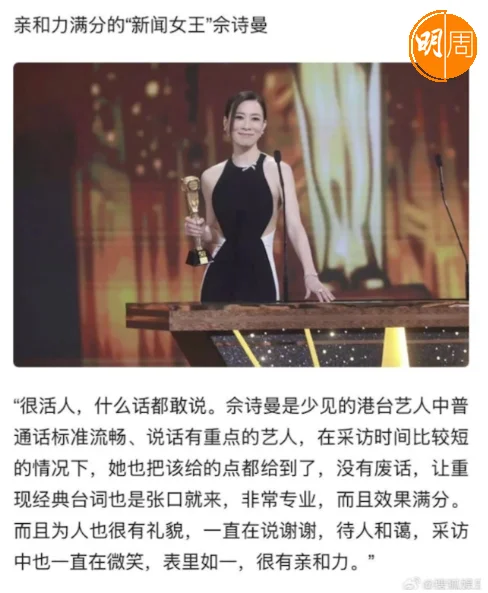 佘詩曼登內地媒體好感度榜 唯一上榜港星獲讚專業夠親和力