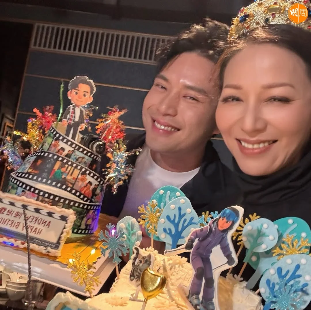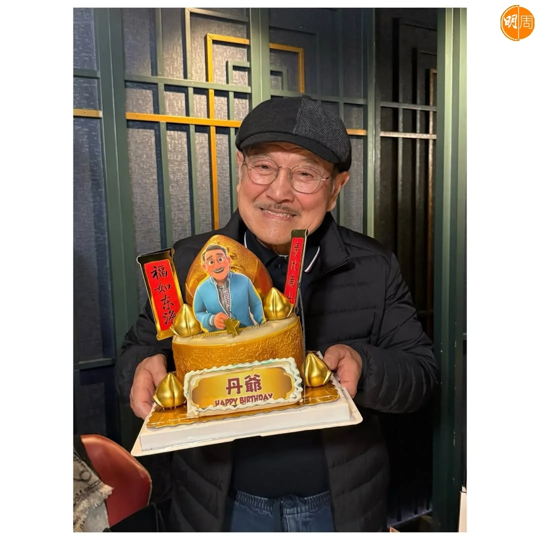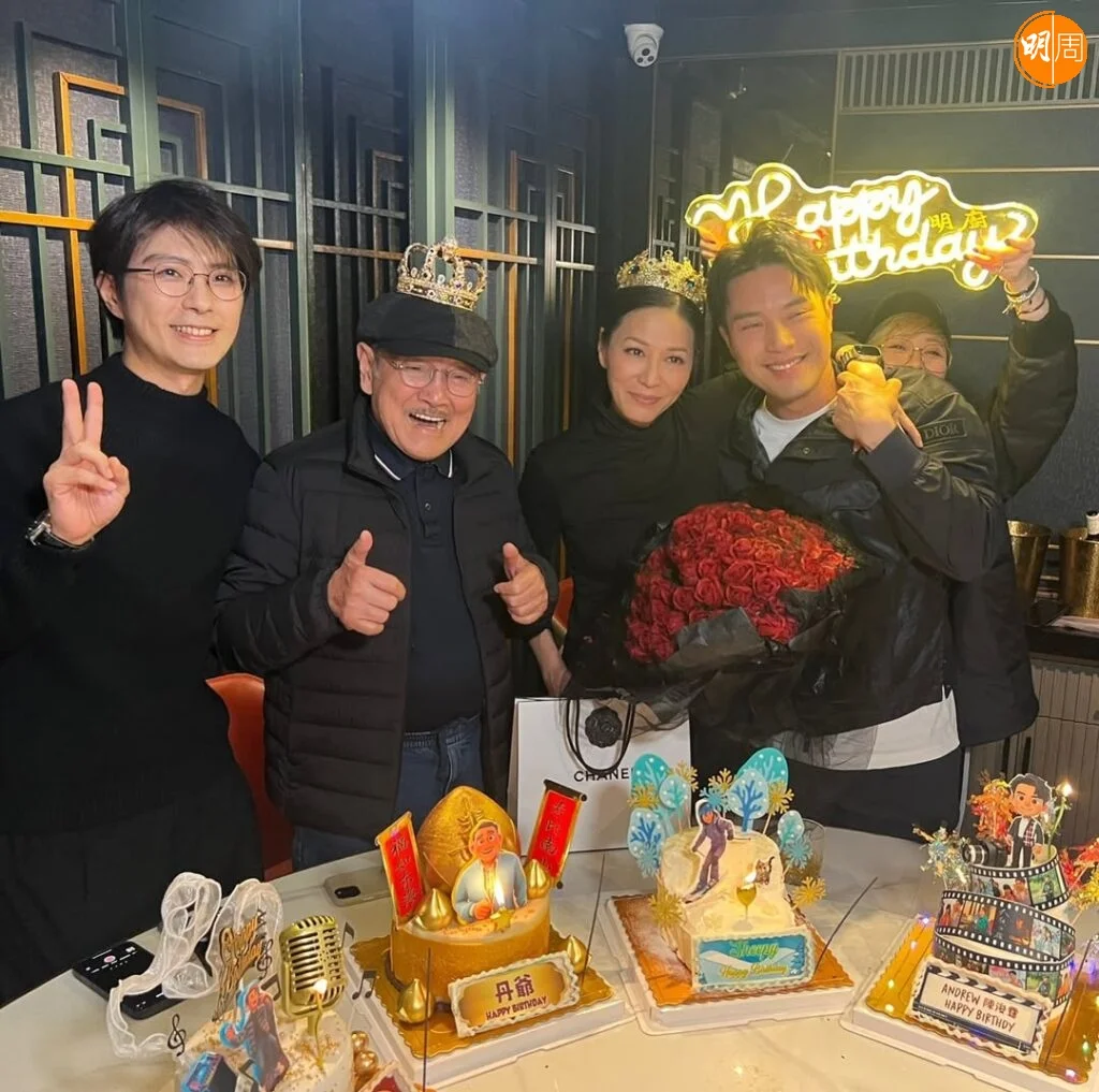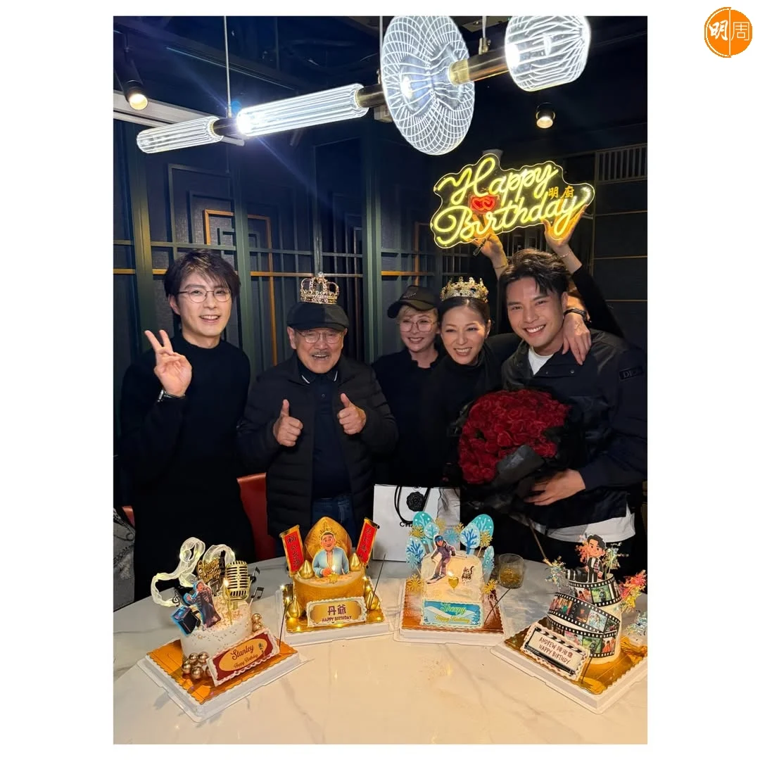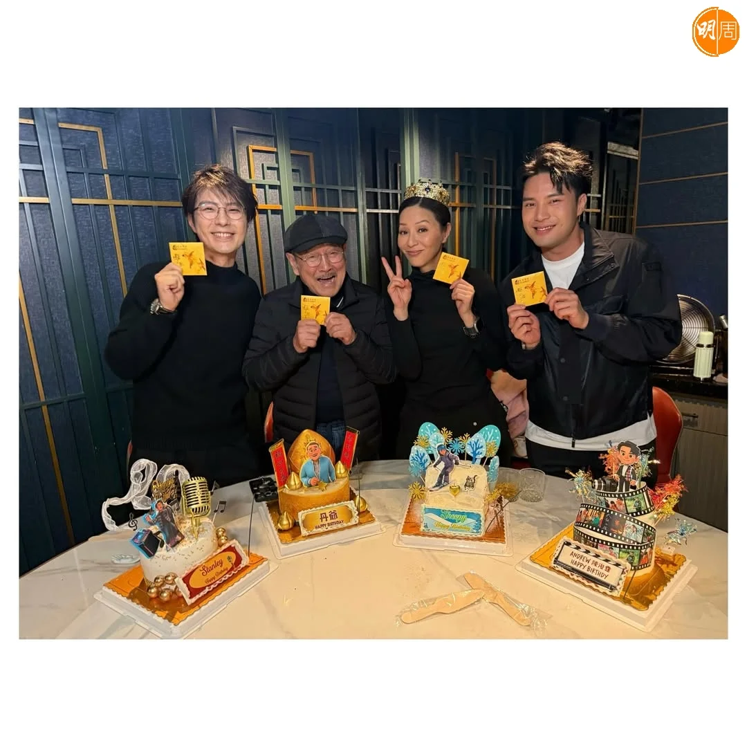 他們為4位壽星送上個別專屬生日蛋糕,當中丹爺獲贈金壽桃蛋糕,寫上「福如東海,壽比南山」;憑電影《尋秦記》人氣急升的「善柔」滕麗名,下周(20日)生日便「入五」,她戴上后冠捧着滑雪英姿造型的蛋糕,十分特別;張景淳的蛋糕有支金咪、陳浚霆蛋糕上面擺放了印有多幅卡通照片的電影菲林裝飾,各見心思。