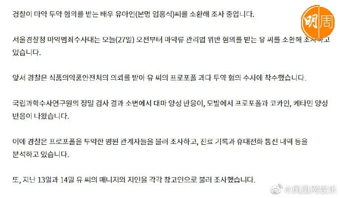 劉亞仁上月6日涉嫌濫藥被立案,其毛髮鑑定結果顯示,體內有麻醉藥異丙酚(Propofol)、大麻及可卡因等成分。劉亞仁表示,「充分了解本人犯下的錯誤,正在反省,任何話都不夠謝罪,對不起,我會盡最大努力,如實說出事實,但會盡力釋疑。」
