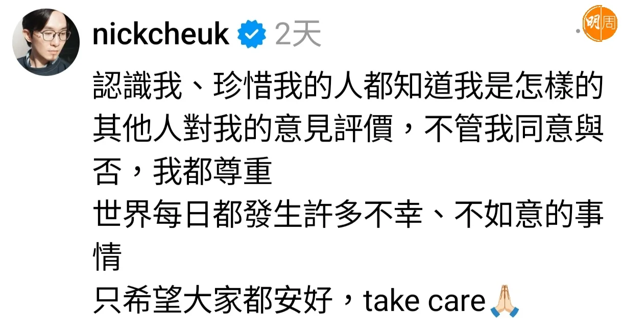 有指卓永興兒子、電影《年少日記》導演卓亦謙亦因此受到牽連,卓亦謙在社交平台發文,「認識我、珍惜我的人都知道我是怎樣的,其他人對我的意見評價,不管我同意與否,我都尊重。世界每日都發生許多不幸、不如意的事情,只希望大家都安好,take care。」