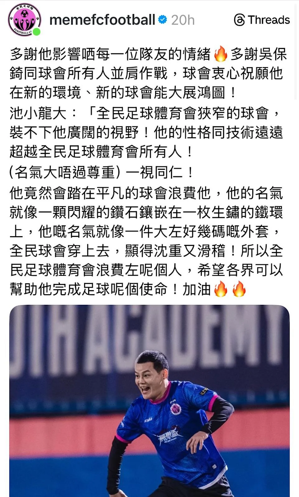 球會在帖文中寫道:「多謝他影響晒每一位隊友的情緒。多謝吳保錡同球會所有人並肩作戰,球會衷心祝願他在新的環境、新的球會能大展鴻圖!」看似祝福,實則句句帶刺。文中更以「池小龍大」形容雙方關係,直言「全民足球體育會狹窄的球會,裝不下他廣闊的視野!他的性格同技術遠遠超越全民足球體育會所有人!」,甚至補上一句(名氣大唔過尊重)一視同仁,語氣相當尖銳。