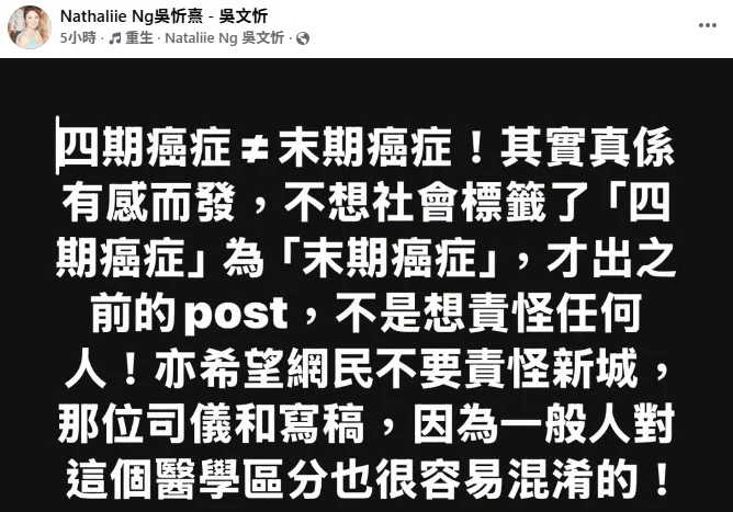 吳文忻(現名吳忻熹,Nathaliie)上周六(27日)在「新城勁爆頒獎禮」終得償所願,以51歲之齡奪「我撐新人」獎,原本很值得高興,但經過一日沉澱後,Nat在社交網發文,坦言當日是有情緒,分別來自正食荷爾蒙鏢靶藥的副作用,及被指這獎是給她的一個安慰獎。另一個原因,Nat直言是當日司儀以「末期癌症病人」介紹她出場,引起她不快。她留言表示:「可能大家覺得冇乜嘢,但是我實在按耐不住要為四期癌症病人發聲,很後悔沒有在台上即時糾正他!請不要再將四期癌症病人標籤為『末期癌症』病人吧!」