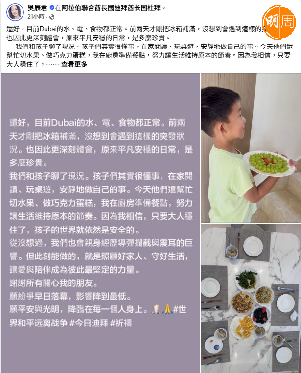 不過她在昨天社交平台報平安,說當地民間設施好正常,「還好,目前Dubai的水、電、食物都正常。前兩天才剛把冰箱補滿,沒想到會遇到這樣的突發狀況。也因此更深刻體會,原來平凡安穩的日常,是多麼珍貴。